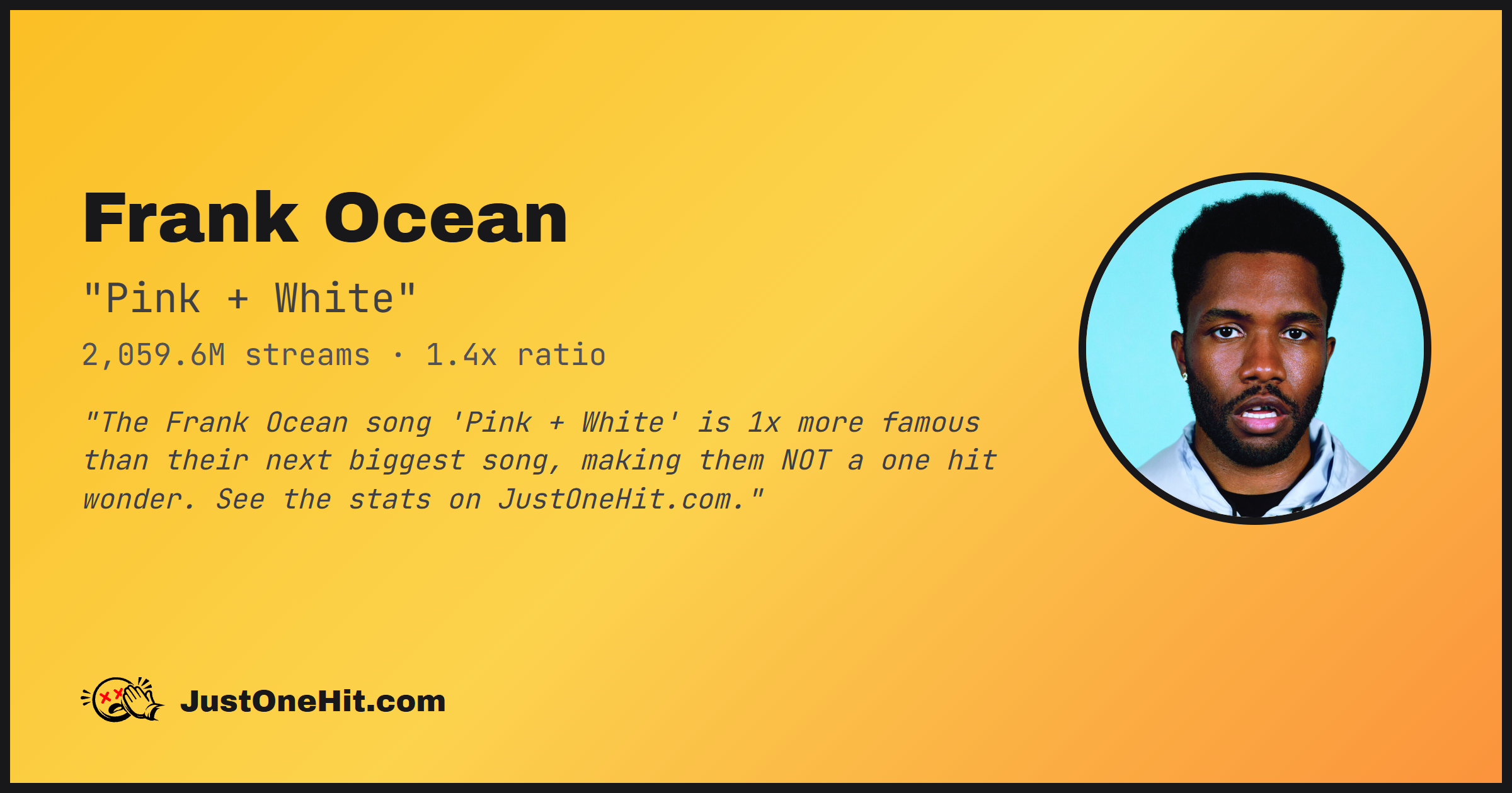 "The Frank Ocean song 'Pink + White' is 1x more famous than their next biggest song, making them NOT a one hit wonder. See the stats on JustOneHit.com."
