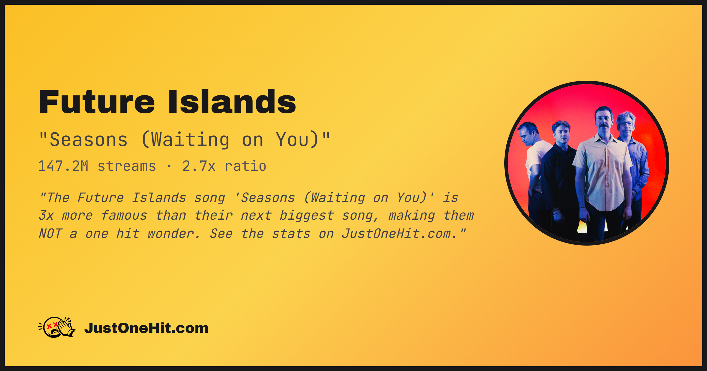 "The Future Islands song 'Seasons (Waiting on You)' is 3x more famous than their next biggest song, making them NOT a one hit wonder. See the stats on JustOneHit.com."