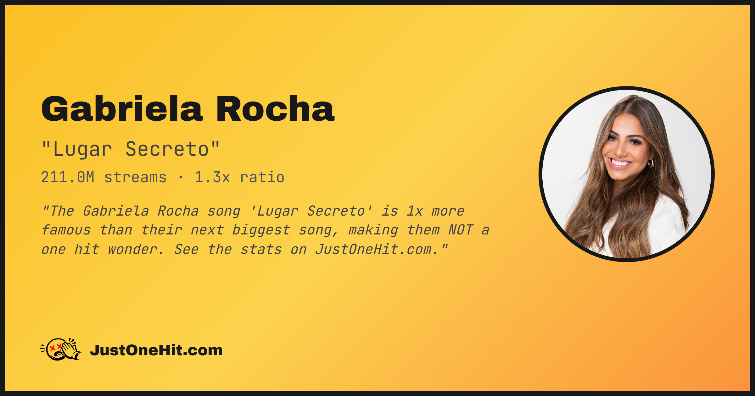 "The Gabriela Rocha song 'Lugar Secreto' is 1x more famous than their next biggest song, making them NOT a one hit wonder. See the stats on JustOneHit.com."
