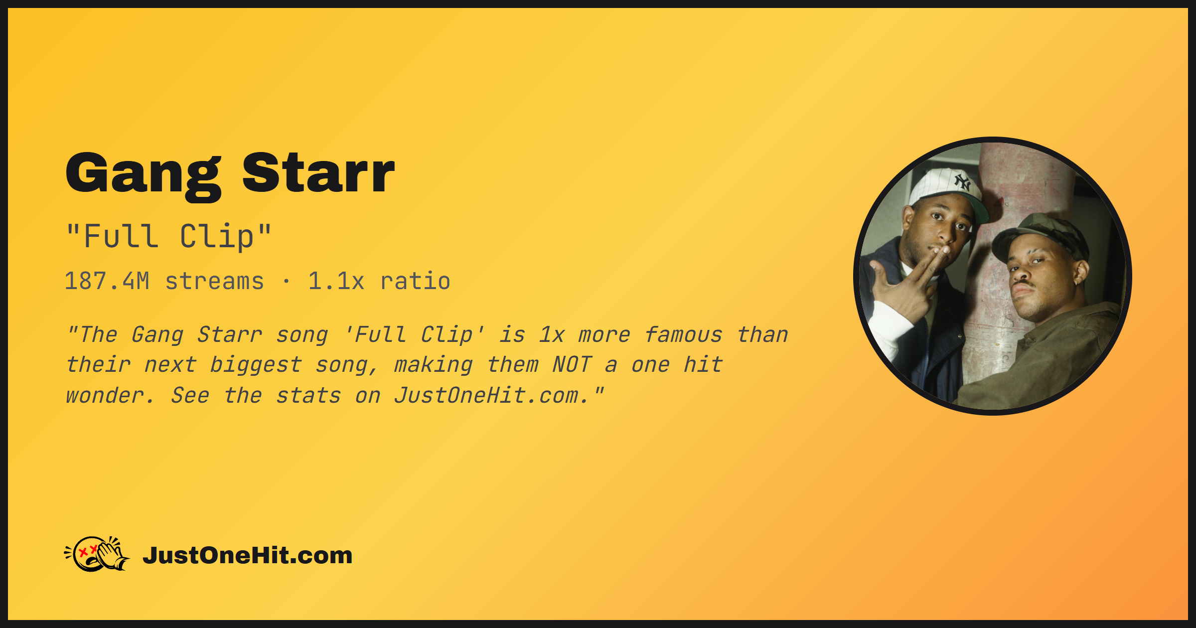 "The Gang Starr song 'Full Clip' is 1x more famous than their next biggest song, making them NOT a one hit wonder. See the stats on JustOneHit.com."