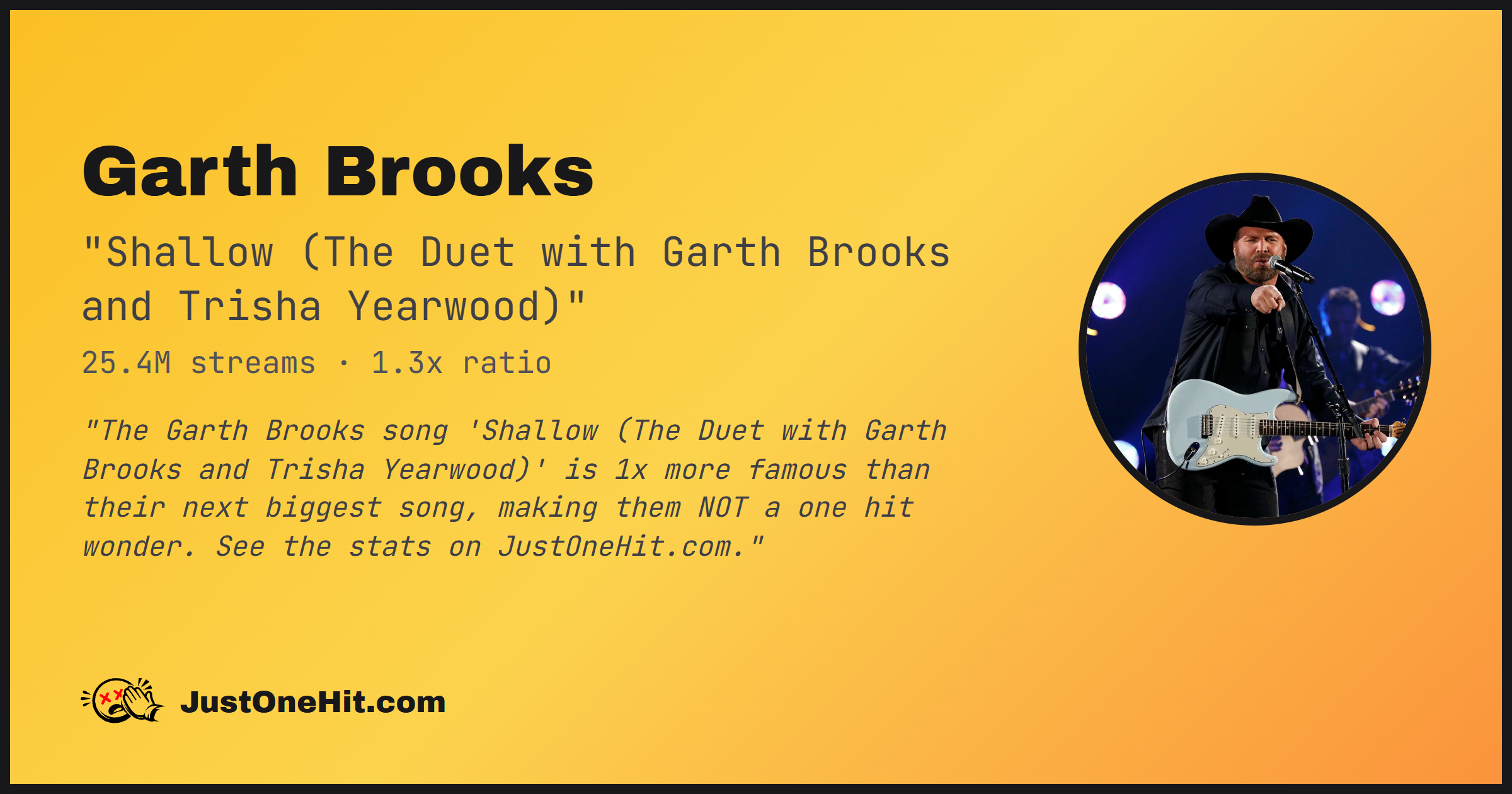 "The Garth Brooks song 'Shallow (The Duet with Garth Brooks and Trisha Yearwood)' is 1x more famous than their next biggest song, making them NOT a one hit wonder. See the stats on JustOneHit.com."