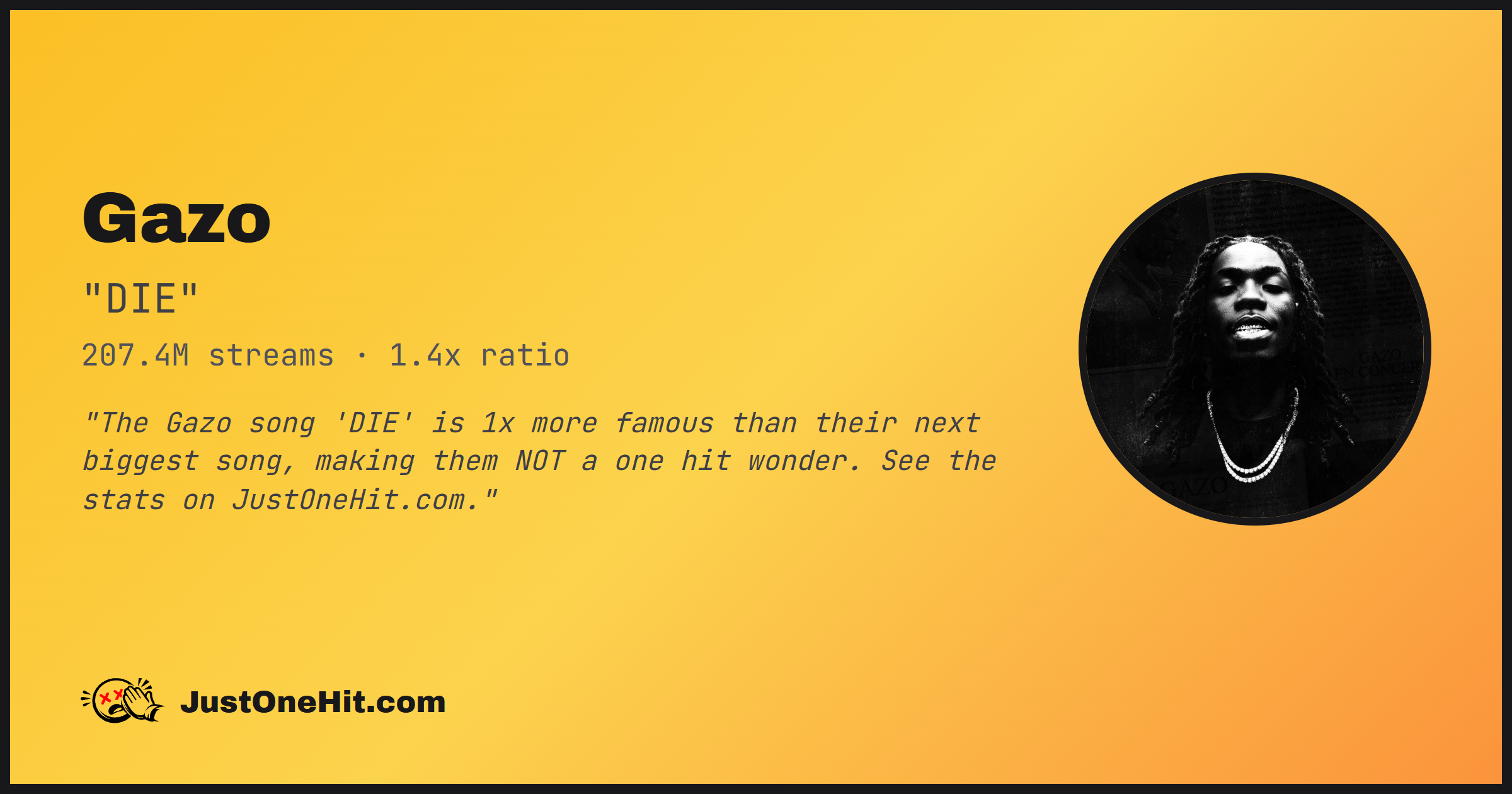 "The Gazo song 'DIE' is 1x more famous than their next biggest song, making them NOT a one hit wonder. See the stats on JustOneHit.com."