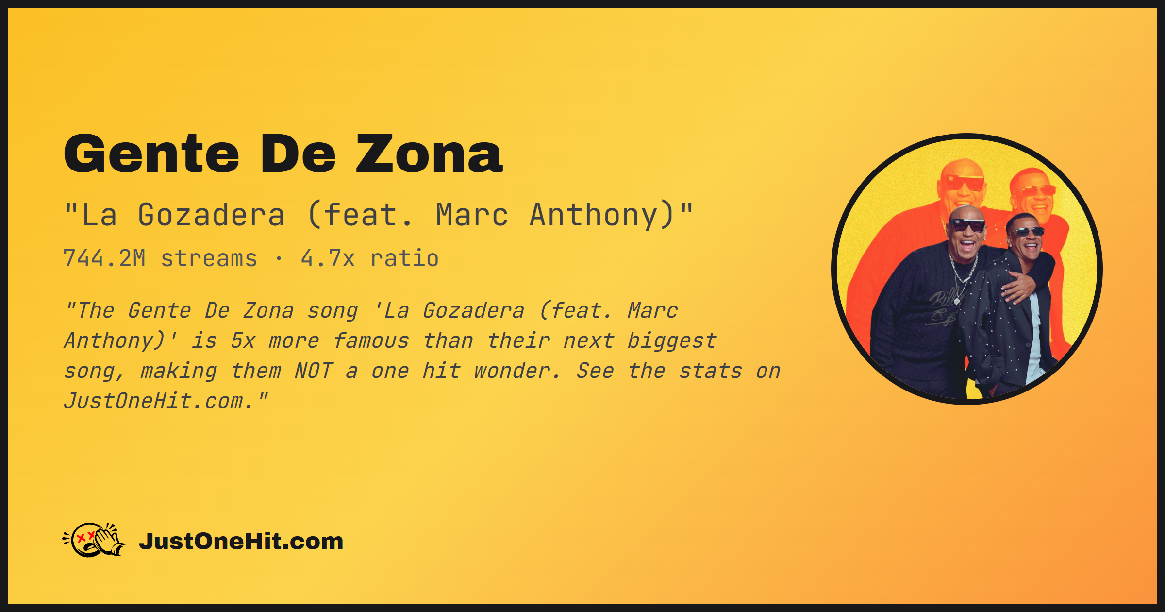 "The Gente De Zona song 'La Gozadera (feat. Marc Anthony)' is 5x more famous than their next biggest song, making them NOT a one hit wonder. See the stats on JustOneHit.com."