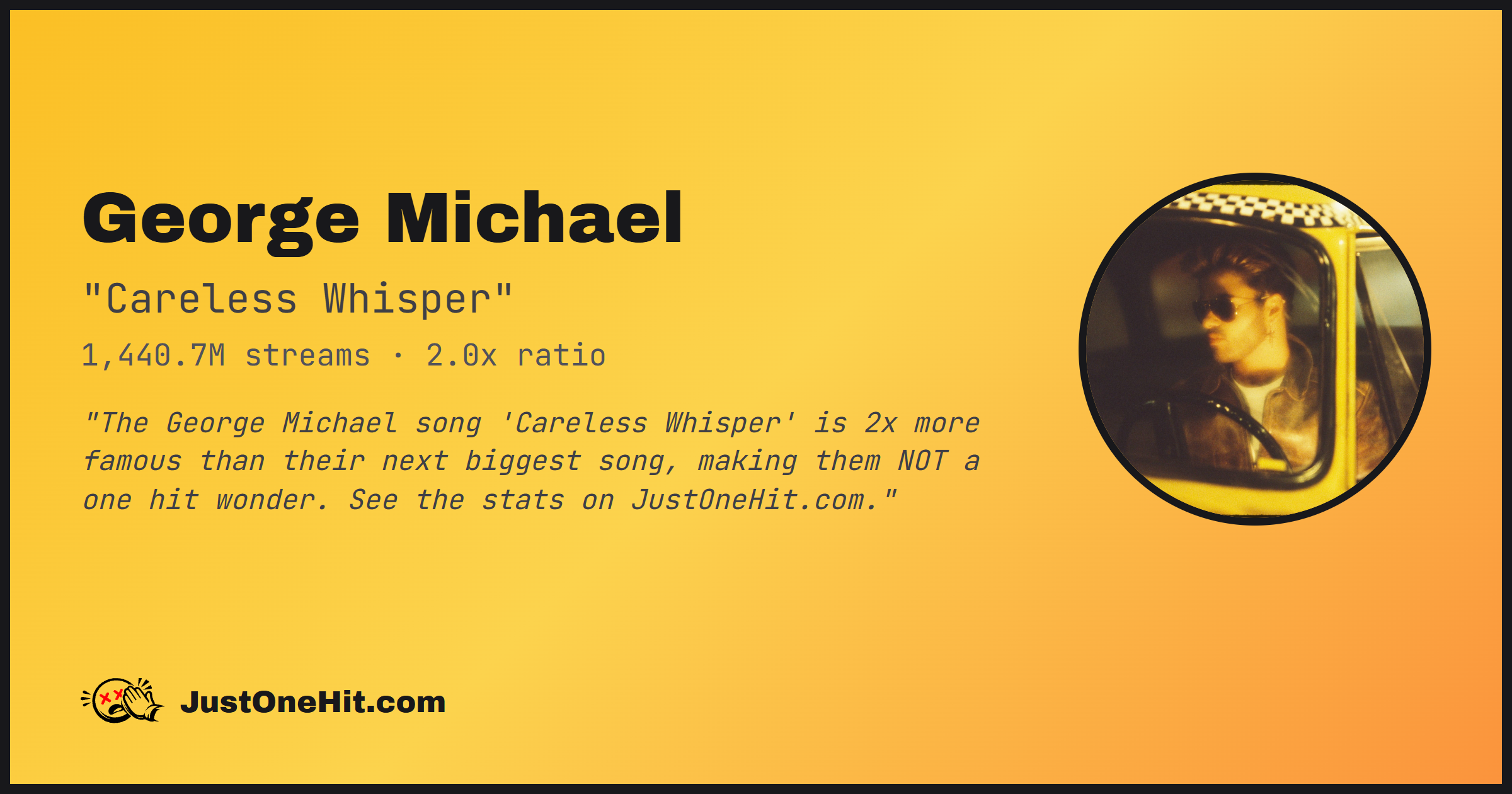 "The George Michael song 'Careless Whisper' is 2x more famous than their next biggest song, making them NOT a one hit wonder. See the stats on JustOneHit.com."