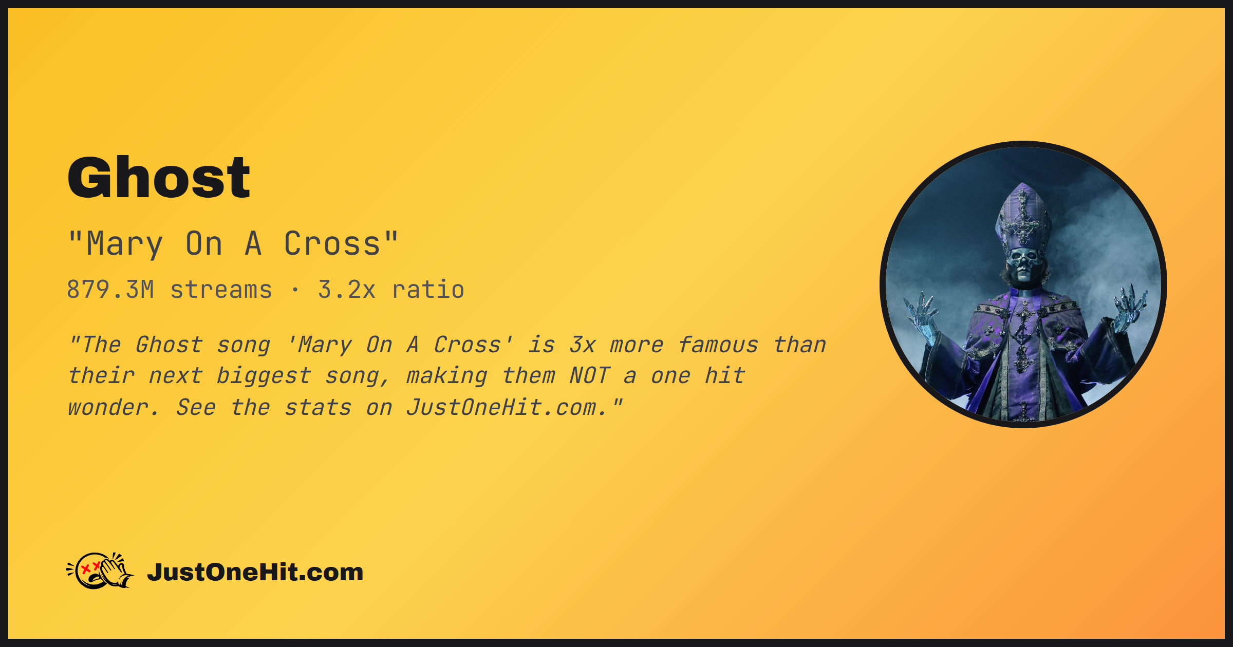 "The Ghost song 'Mary On A Cross' is 3x more famous than their next biggest song, making them NOT a one hit wonder. See the stats on JustOneHit.com."