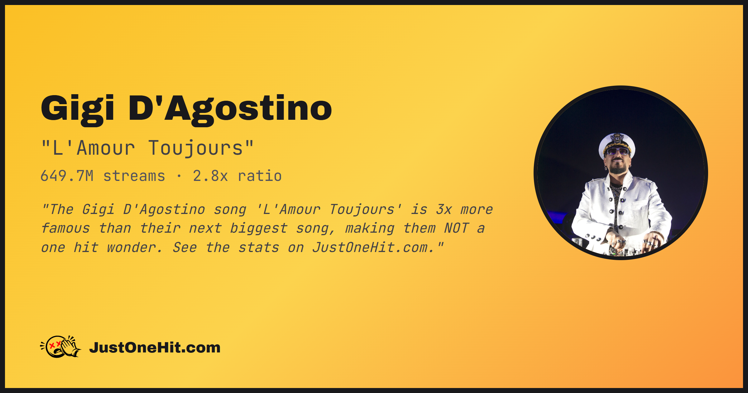 "The Gigi D'Agostino song 'L'Amour Toujours' is 3x more famous than their next biggest song, making them NOT a one hit wonder. See the stats on JustOneHit.com."