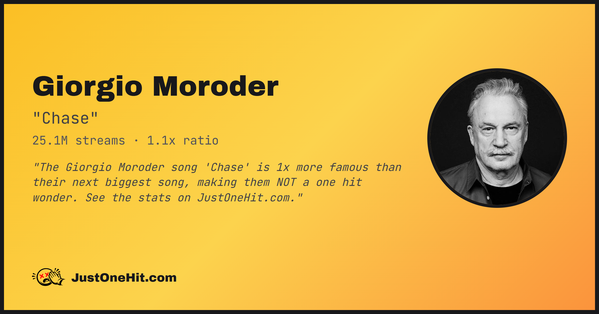 "The Giorgio Moroder song 'Chase' is 1x more famous than their next biggest song, making them NOT a one hit wonder. See the stats on JustOneHit.com."