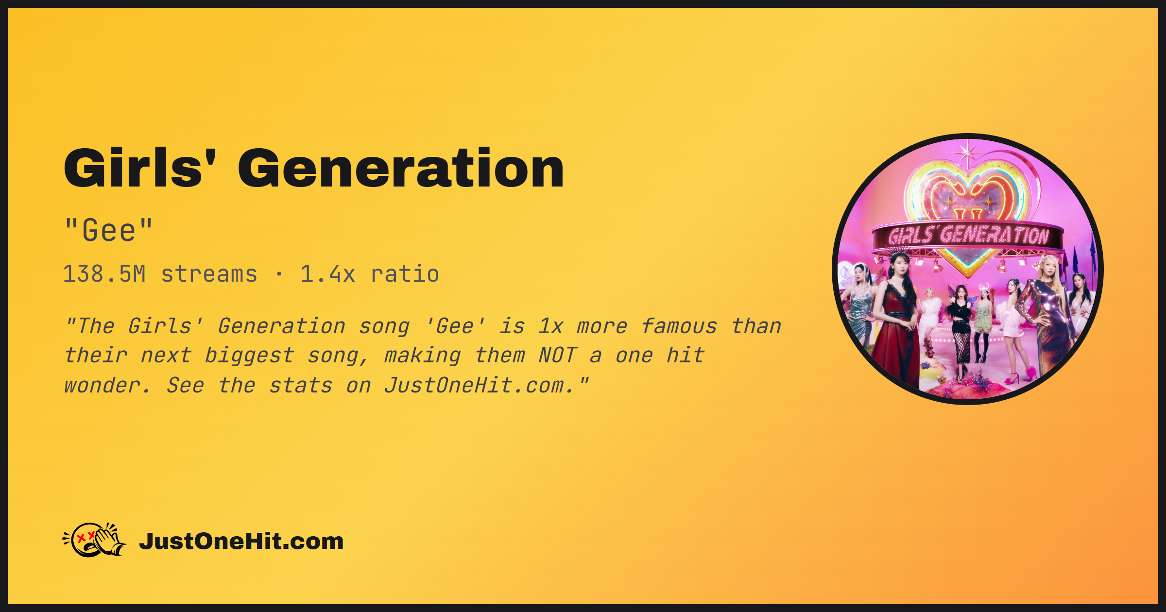 "The Girls' Generation song 'Gee' is 1x more famous than their next biggest song, making them NOT a one hit wonder. See the stats on JustOneHit.com."
