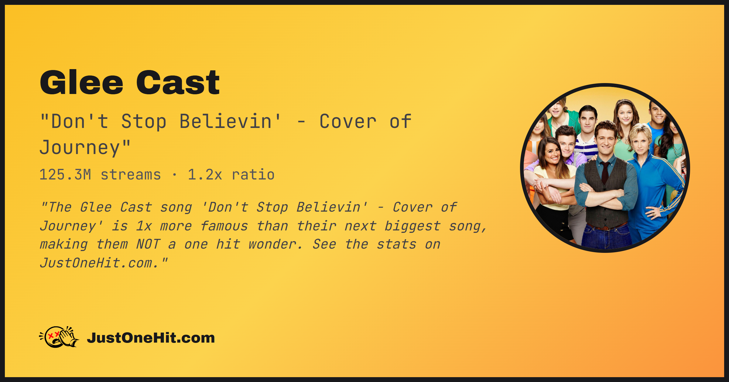 "The Glee Cast song 'Don't Stop Believin' - Cover of Journey' is 1x more famous than their next biggest song, making them NOT a one hit wonder. See the stats on JustOneHit.com."