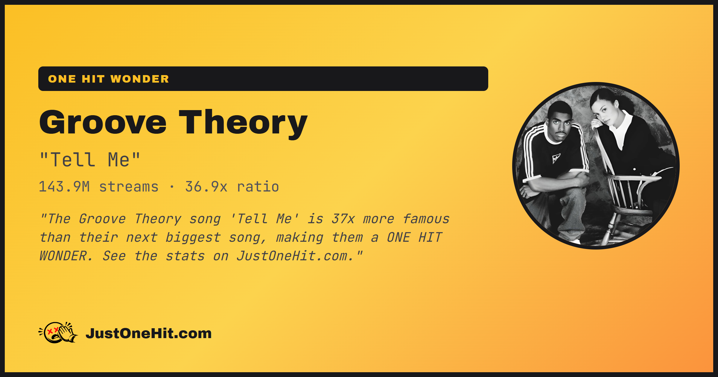 "The Groove Theory song 'Tell Me' is 37x more famous than their next biggest song, making them a ONE HIT WONDER. See the stats on JustOneHit.com."