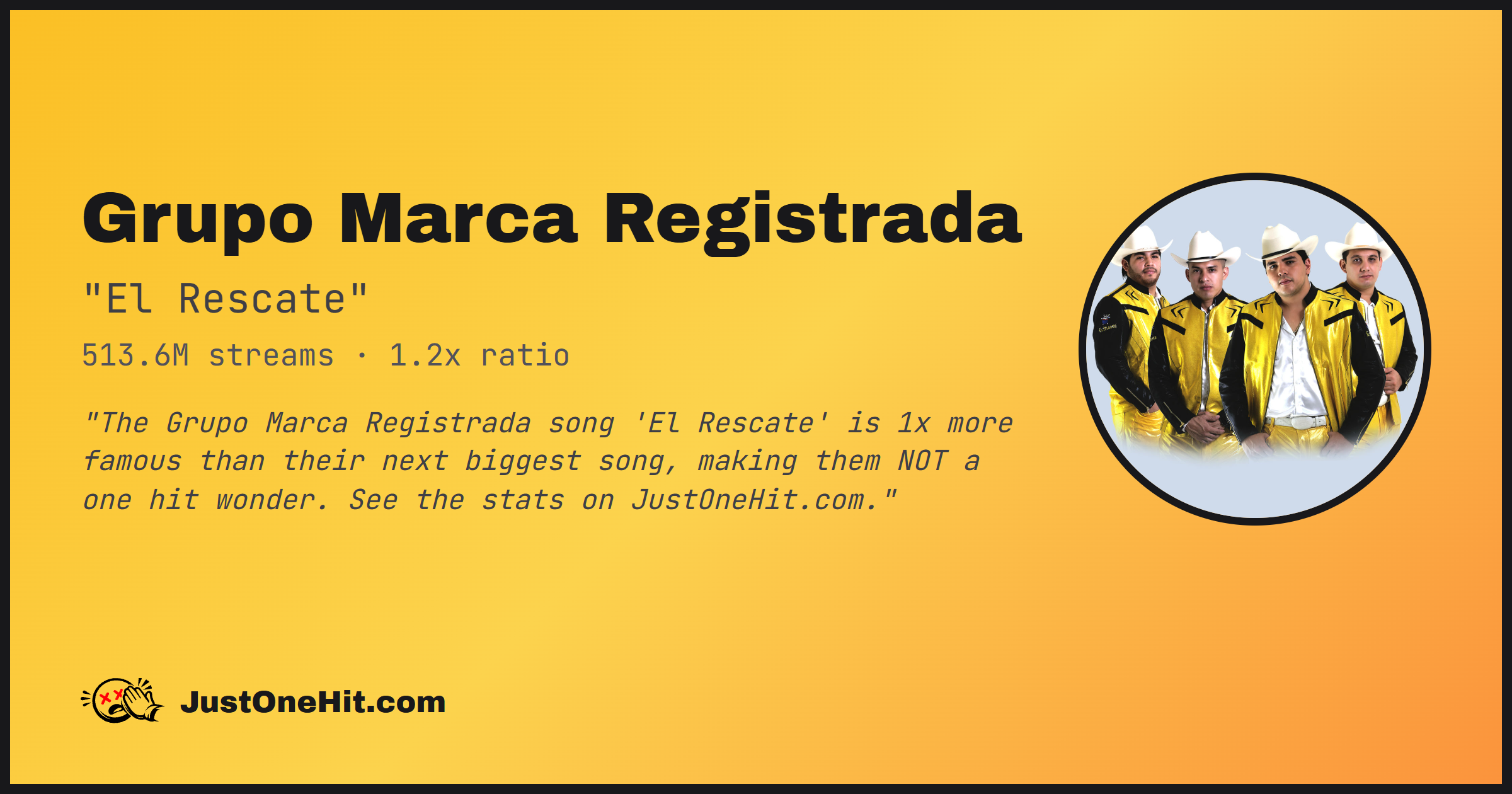 "The Grupo Marca Registrada song 'El Rescate' is 1x more famous than their next biggest song, making them NOT a one hit wonder. See the stats on JustOneHit.com."