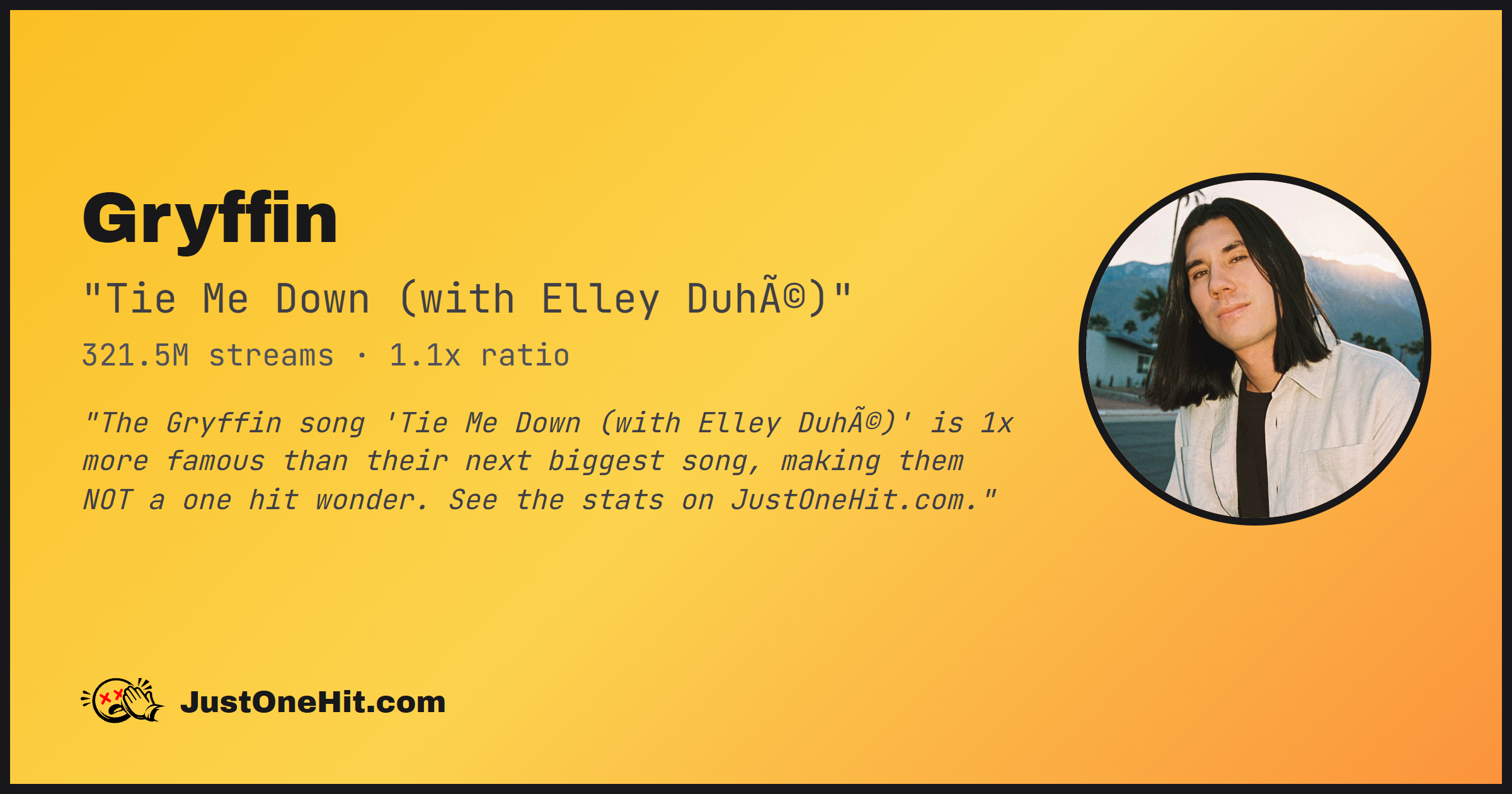 "The Gryffin song 'Tie Me Down (with Elley Duhé)' is 1x more famous than their next biggest song, making them NOT a one hit wonder. See the stats on JustOneHit.com."