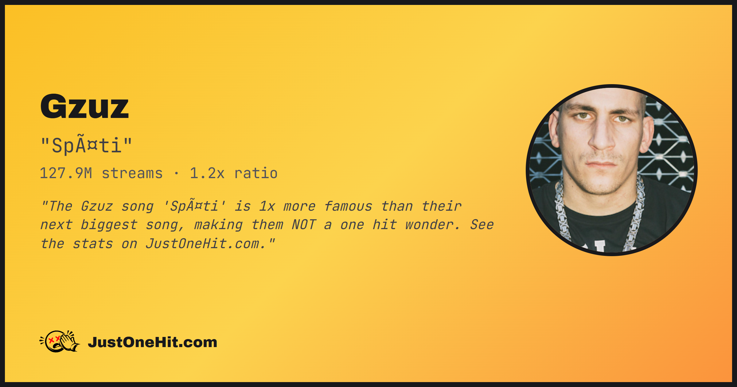 "The Gzuz song 'Späti' is 1x more famous than their next biggest song, making them NOT a one hit wonder. See the stats on JustOneHit.com."