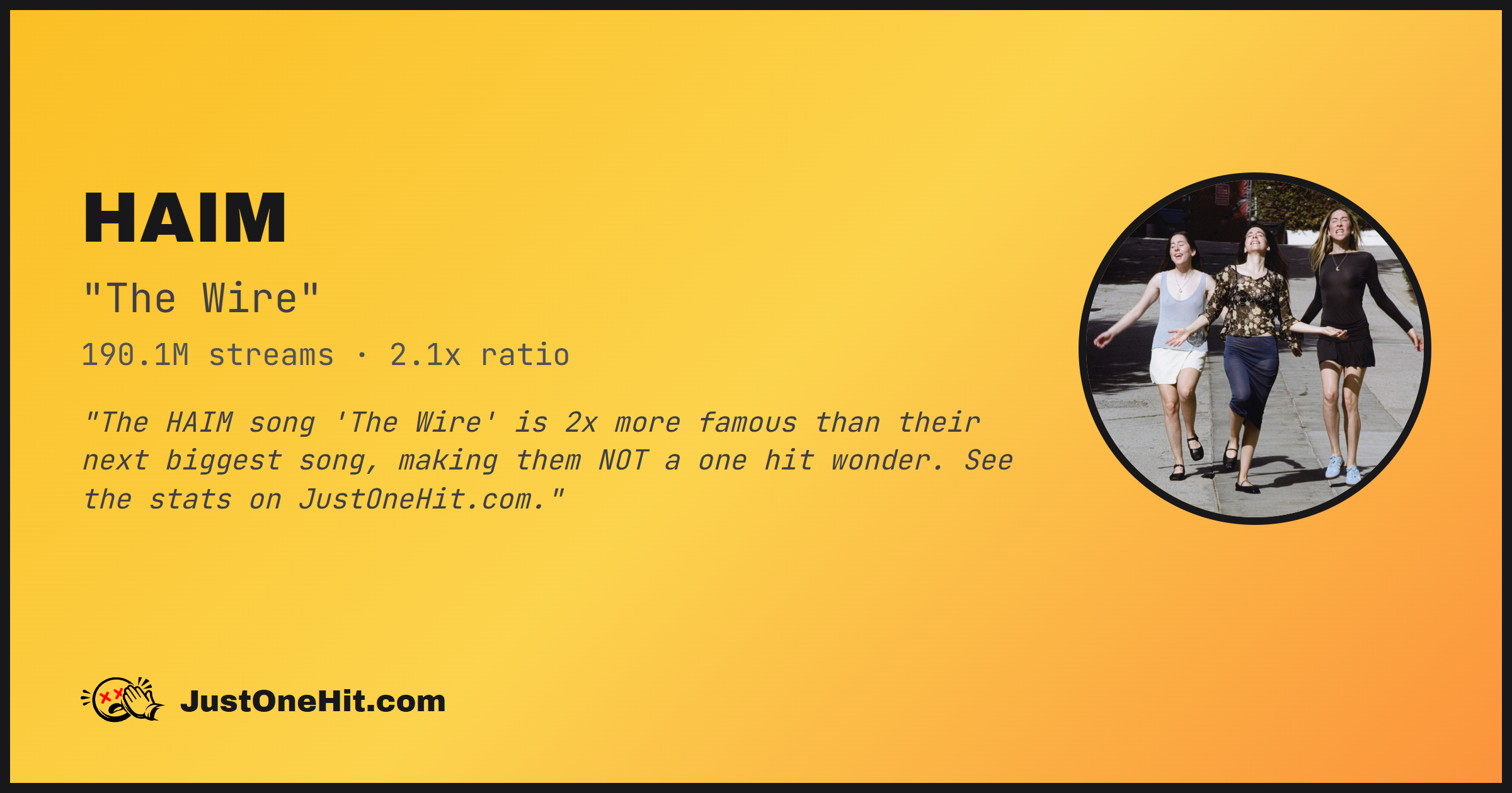 "The HAIM song 'The Wire' is 2x more famous than their next biggest song, making them NOT a one hit wonder. See the stats on JustOneHit.com."