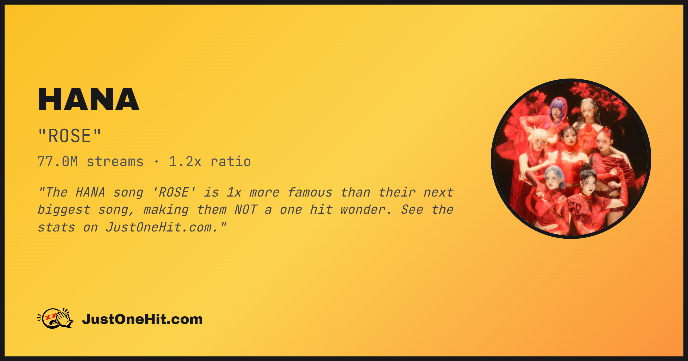 "The HANA song 'ROSE' is 1x more famous than their next biggest song, making them NOT a one hit wonder. See the stats on JustOneHit.com."
