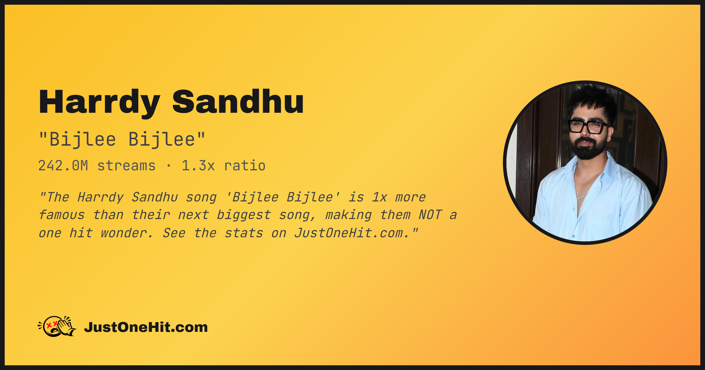 "The Harrdy Sandhu song 'Bijlee Bijlee' is 1x more famous than their next biggest song, making them NOT a one hit wonder. See the stats on JustOneHit.com."