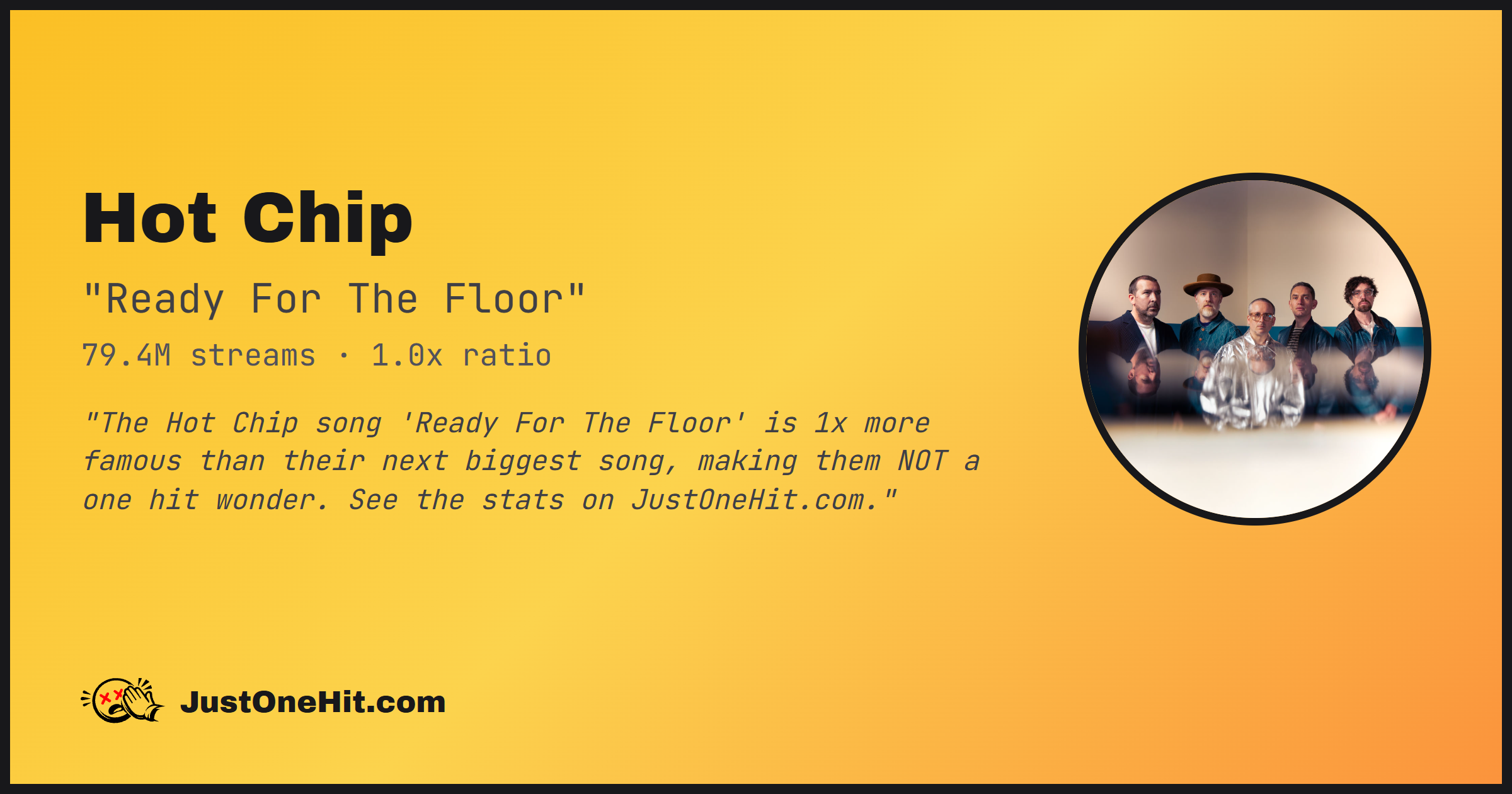 "The Hot Chip song 'Ready For The Floor' is 1x more famous than their next biggest song, making them NOT a one hit wonder. See the stats on JustOneHit.com."