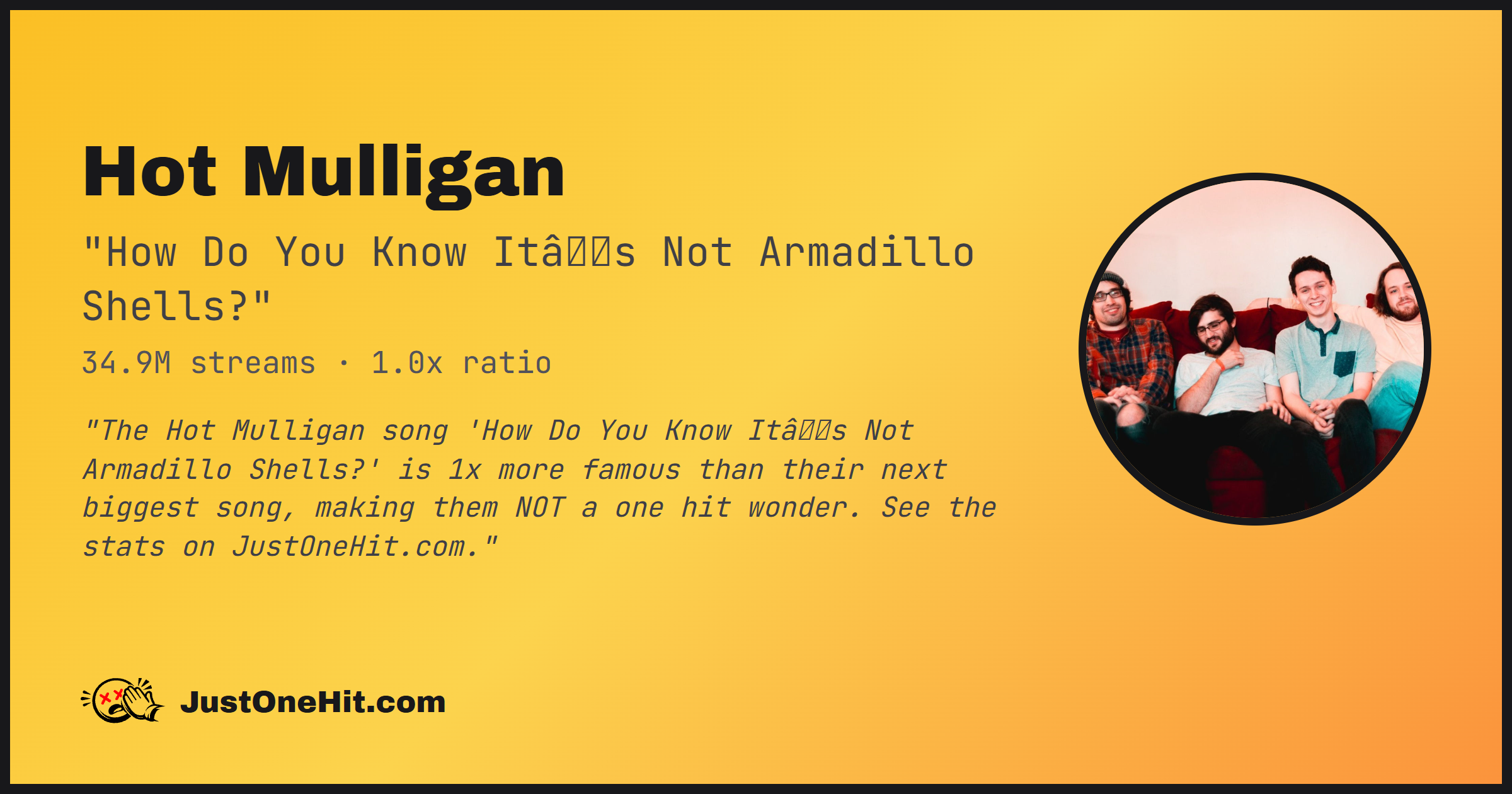 "The Hot Mulligan song 'How Do You Know Itâs Not Armadillo Shells?' is 1x more famous than their next biggest song, making them NOT a one hit wonder. See the stats on JustOneHit.com."