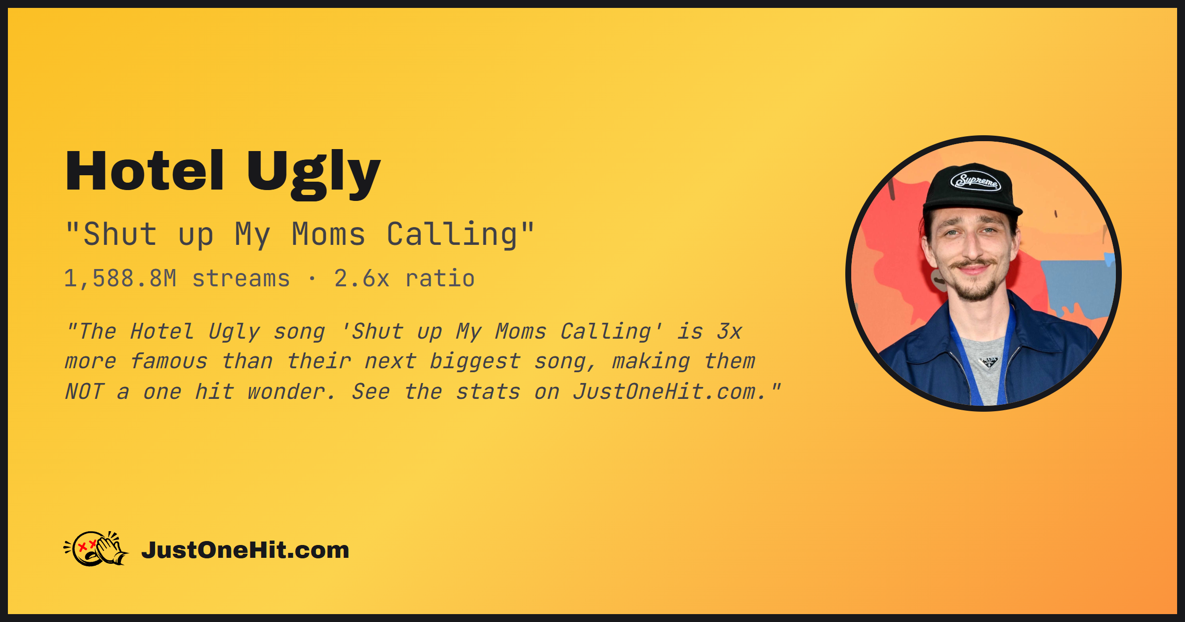 "The Hotel Ugly song 'Shut up My Moms Calling' is 3x more famous than their next biggest song, making them NOT a one hit wonder. See the stats on JustOneHit.com."