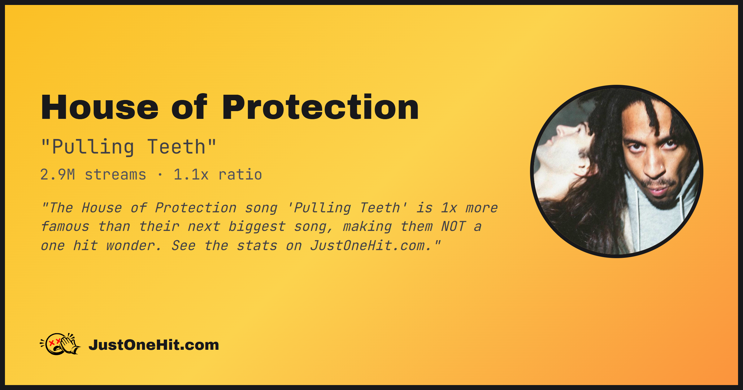 "The House of Protection song 'Pulling Teeth' is 1x more famous than their next biggest song, making them NOT a one hit wonder. See the stats on JustOneHit.com."