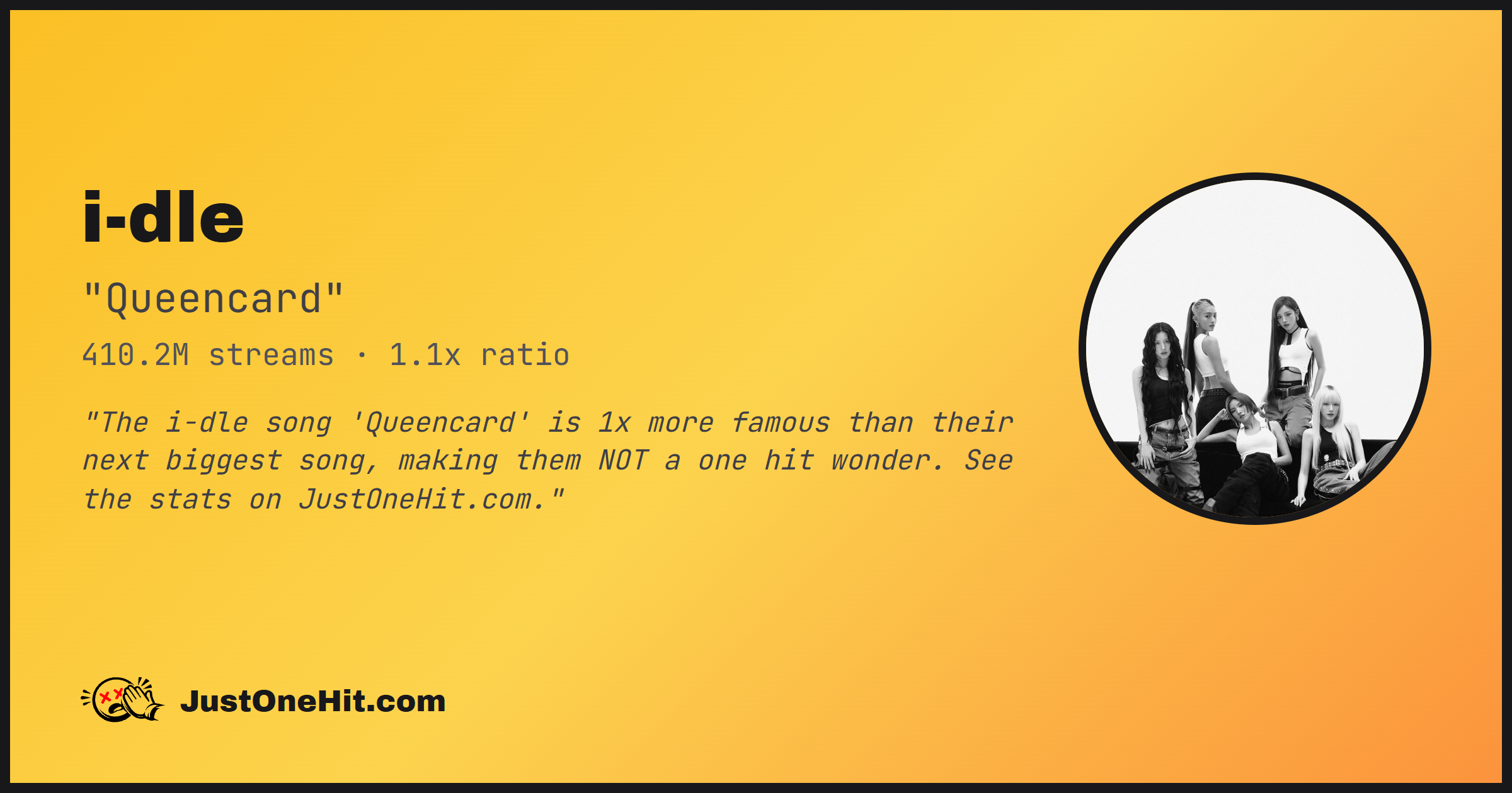 "The i-dle song 'Queencard' is 1x more famous than their next biggest song, making them NOT a one hit wonder. See the stats on JustOneHit.com."