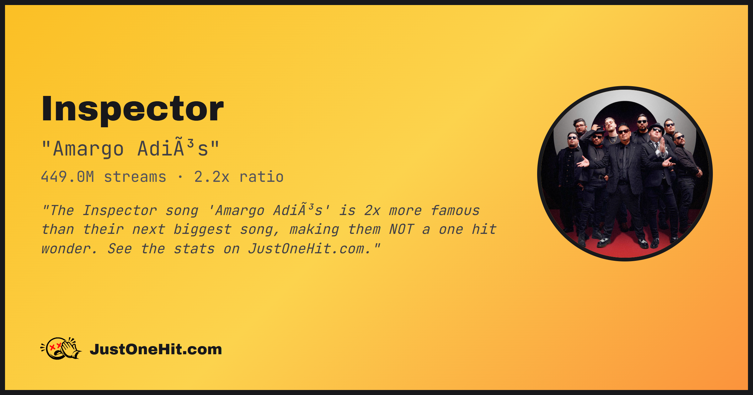 "The Inspector song 'Amargo Adiós' is 2x more famous than their next biggest song, making them NOT a one hit wonder. See the stats on JustOneHit.com."