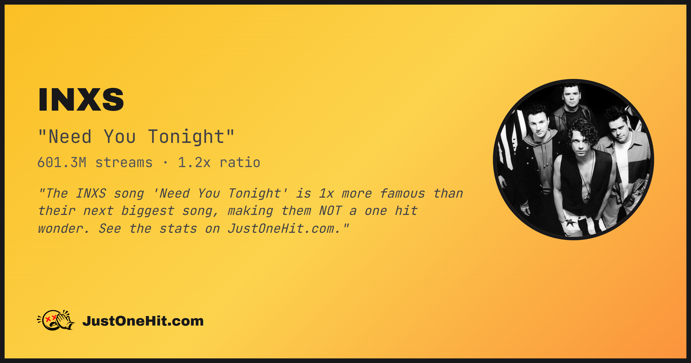 "The INXS song 'Need You Tonight' is 1x more famous than their next biggest song, making them NOT a one hit wonder. See the stats on JustOneHit.com."