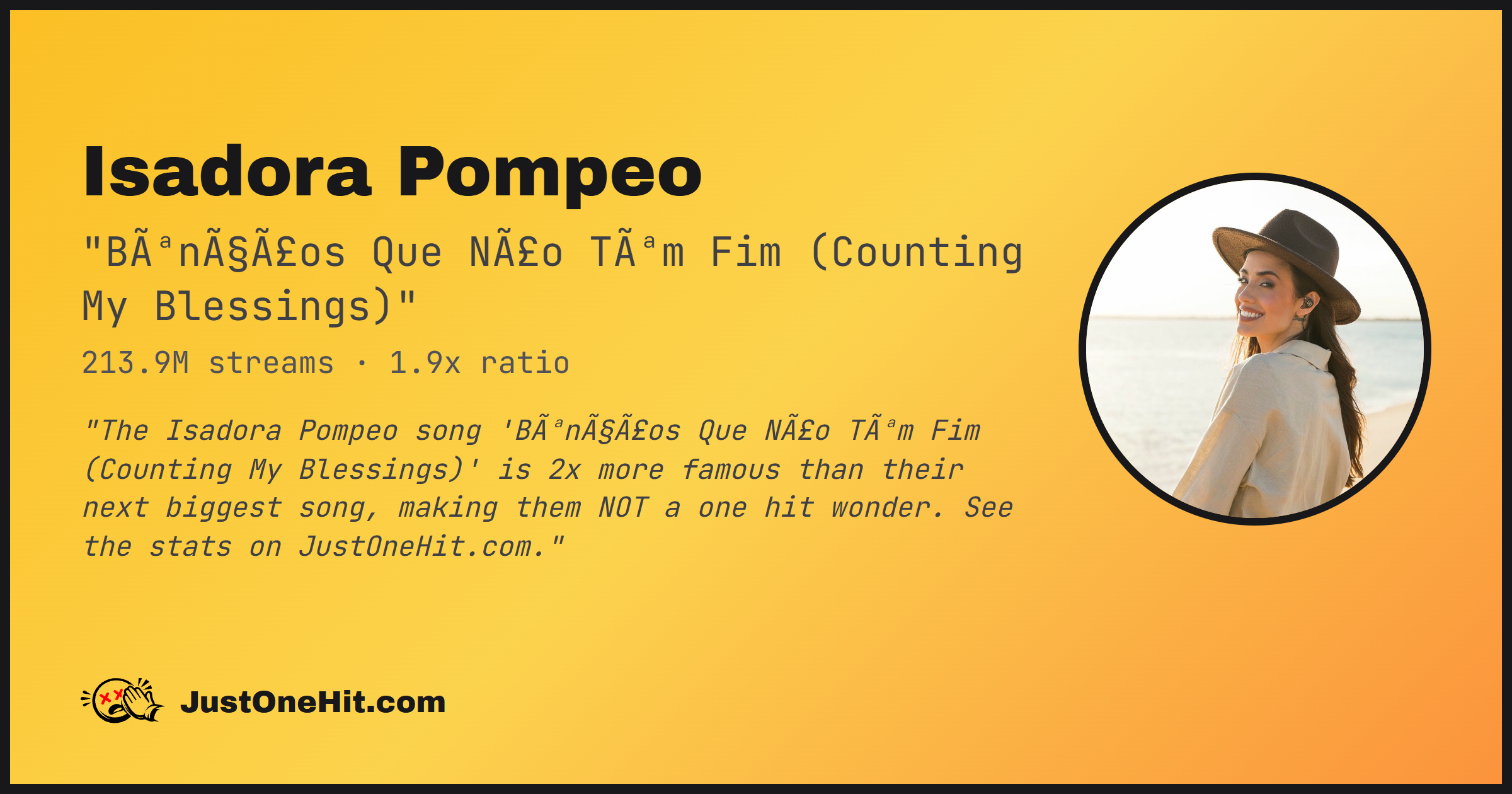 "The Isadora Pompeo song 'Bênçãos Que Não Têm Fim (Counting My Blessings)' is 2x more famous than their next biggest song, making them NOT a one hit wonder. See the stats on JustOneHit.com."