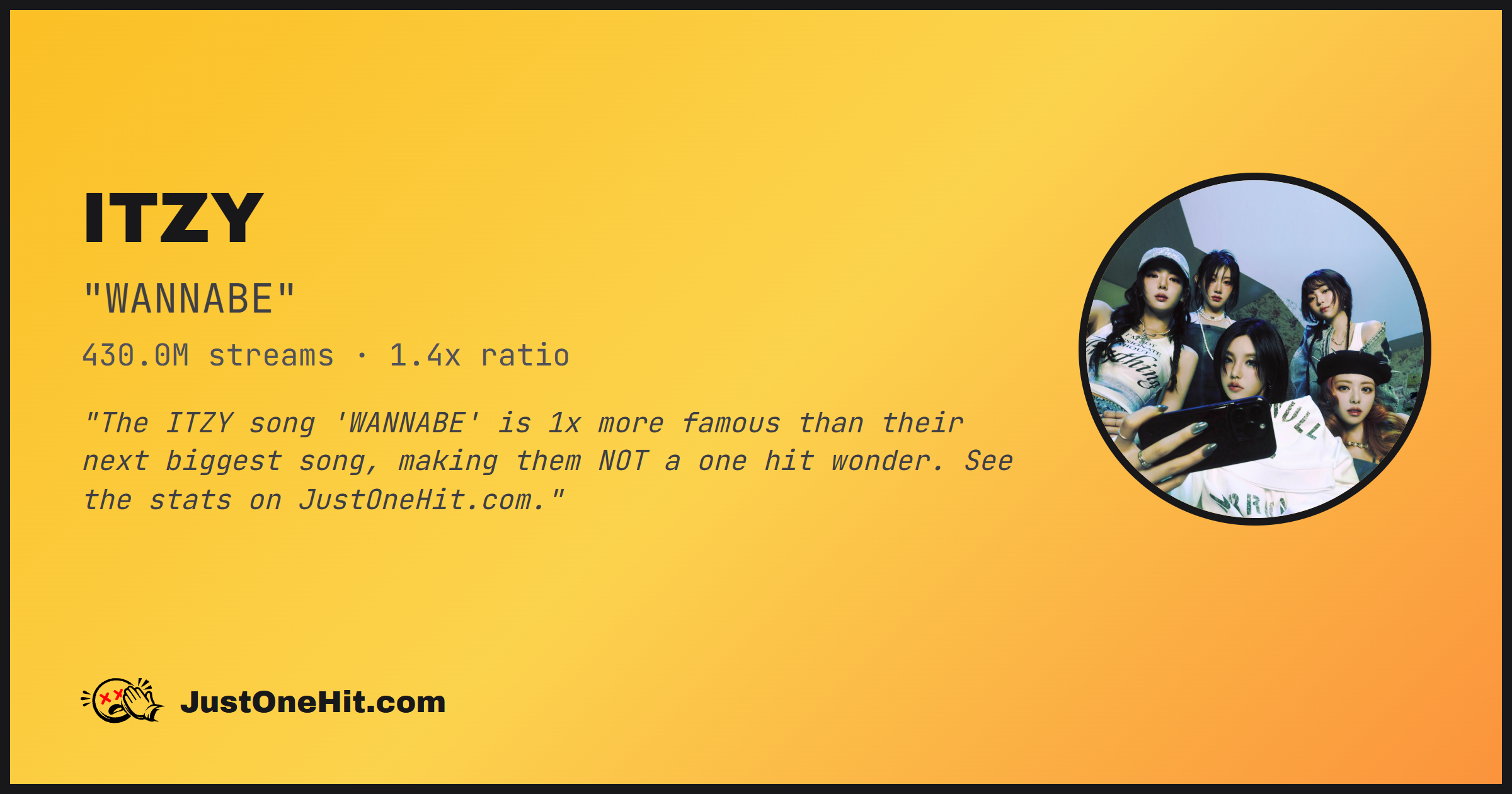 "The ITZY song 'WANNABE' is 1x more famous than their next biggest song, making them NOT a one hit wonder. See the stats on JustOneHit.com."