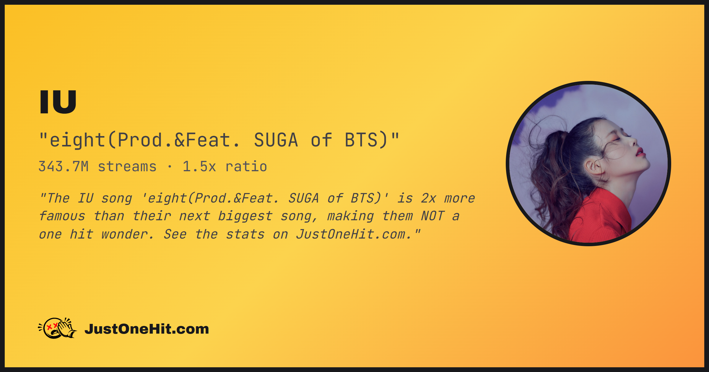 "The IU song 'eight(Prod.&Feat. SUGA of BTS)' is 2x more famous than their next biggest song, making them NOT a one hit wonder. See the stats on JustOneHit.com."