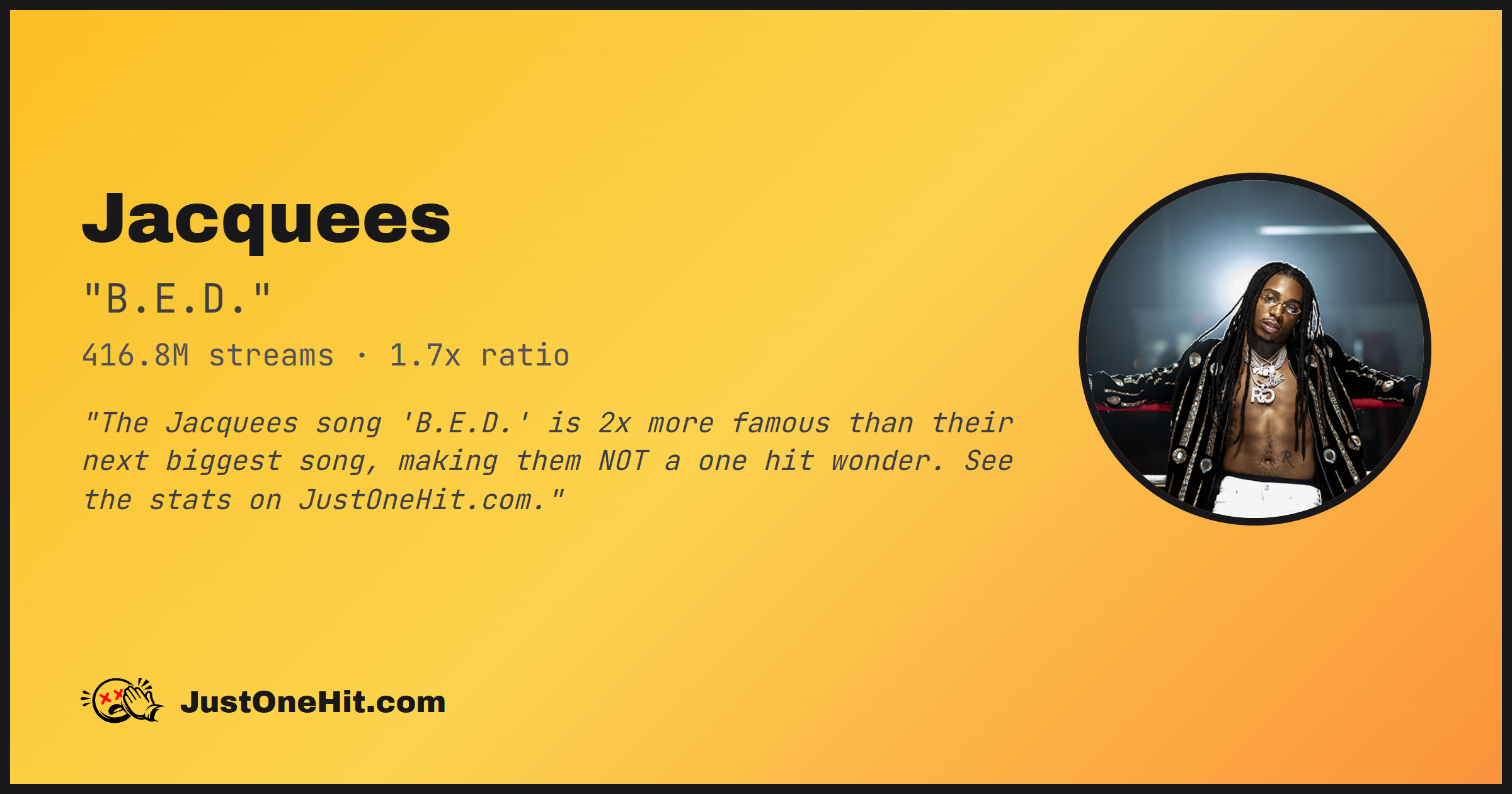 "The Jacquees song 'B.E.D.' is 2x more famous than their next biggest song, making them NOT a one hit wonder. See the stats on JustOneHit.com."