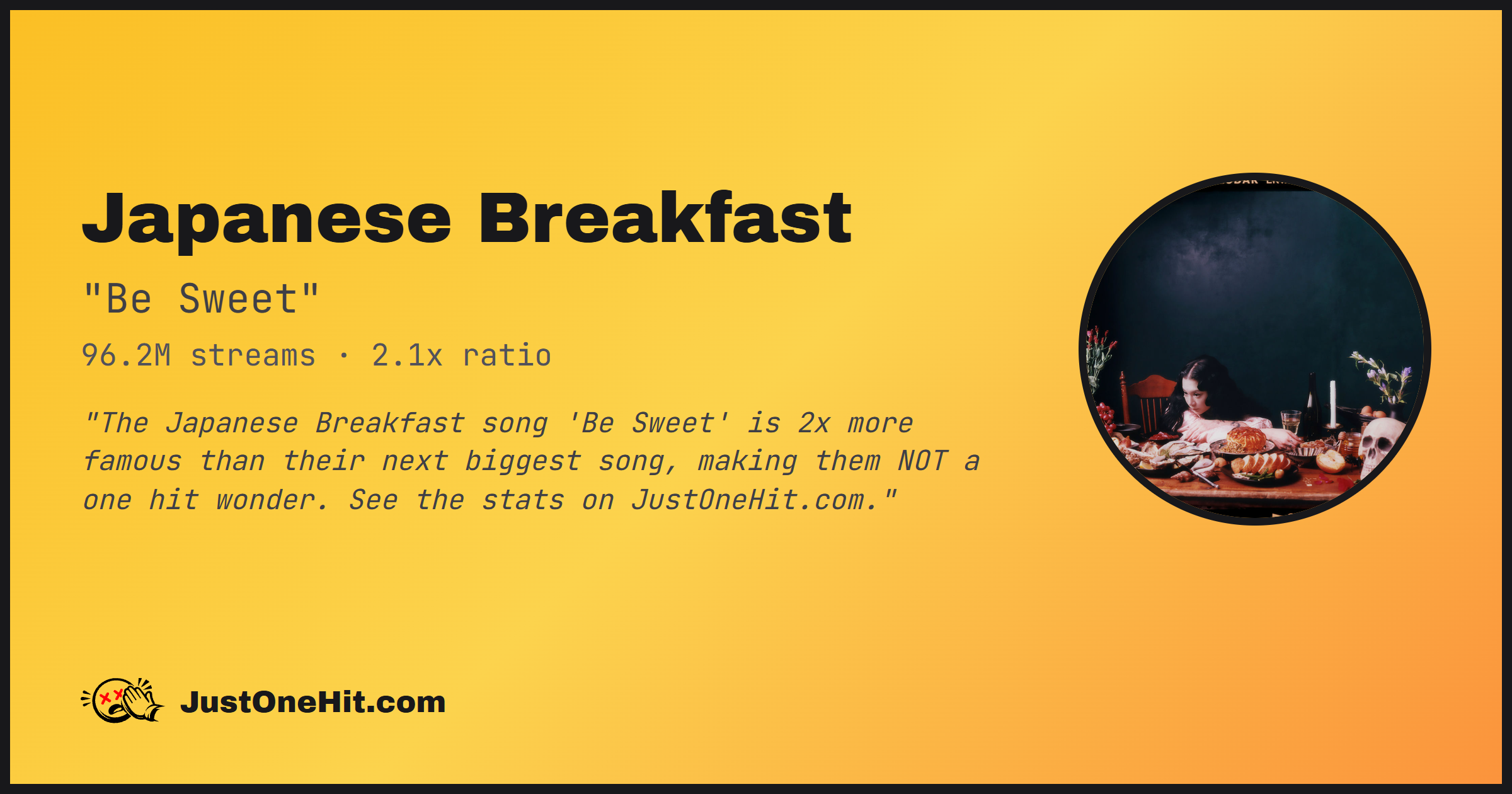 "The Japanese Breakfast song 'Be Sweet' is 2x more famous than their next biggest song, making them NOT a one hit wonder. See the stats on JustOneHit.com."