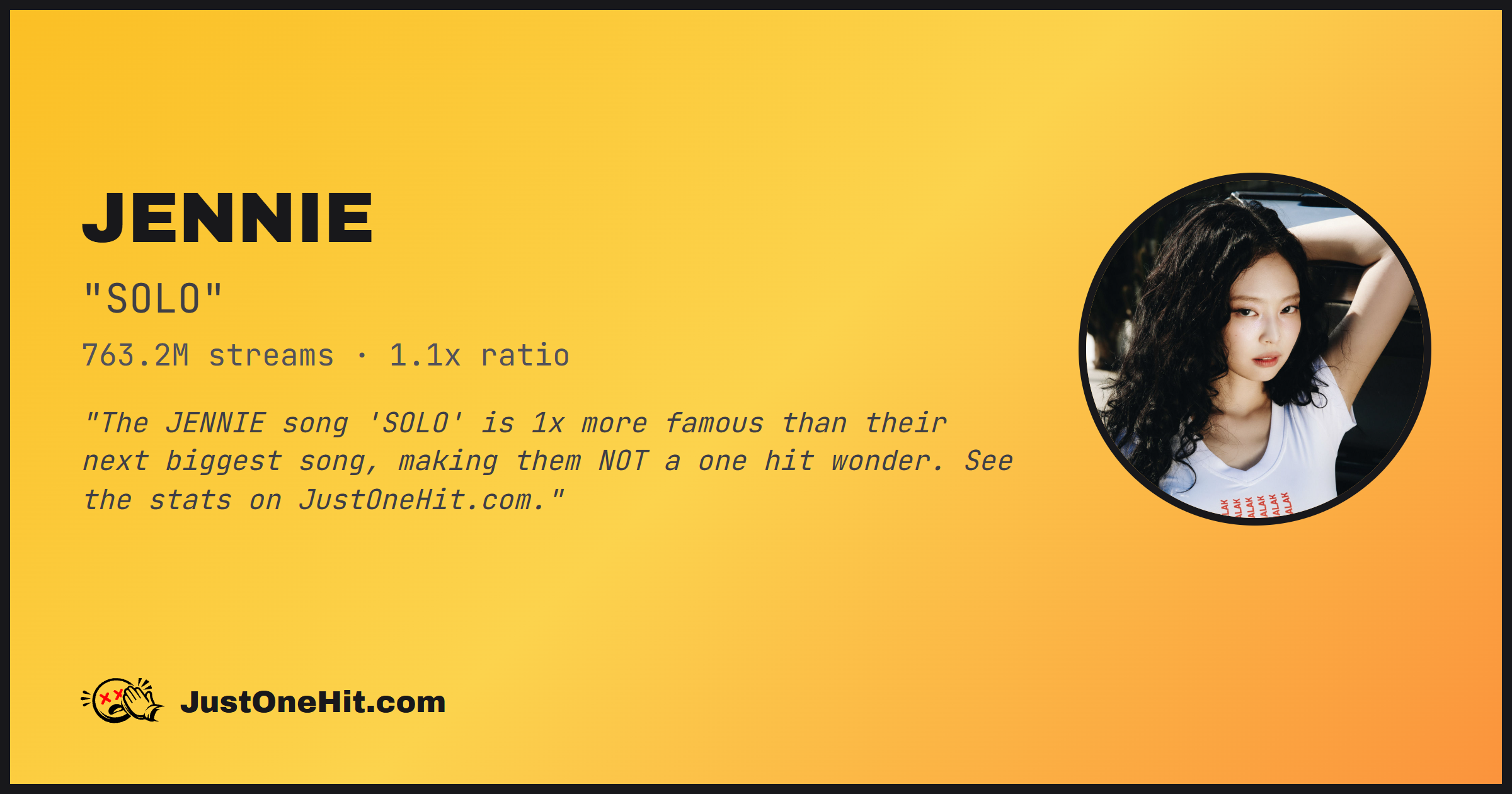 "The JENNIE song 'like JENNIE' is 1x more famous than their next biggest song, making them NOT a one hit wonder. See the stats on JustOneHit.com."