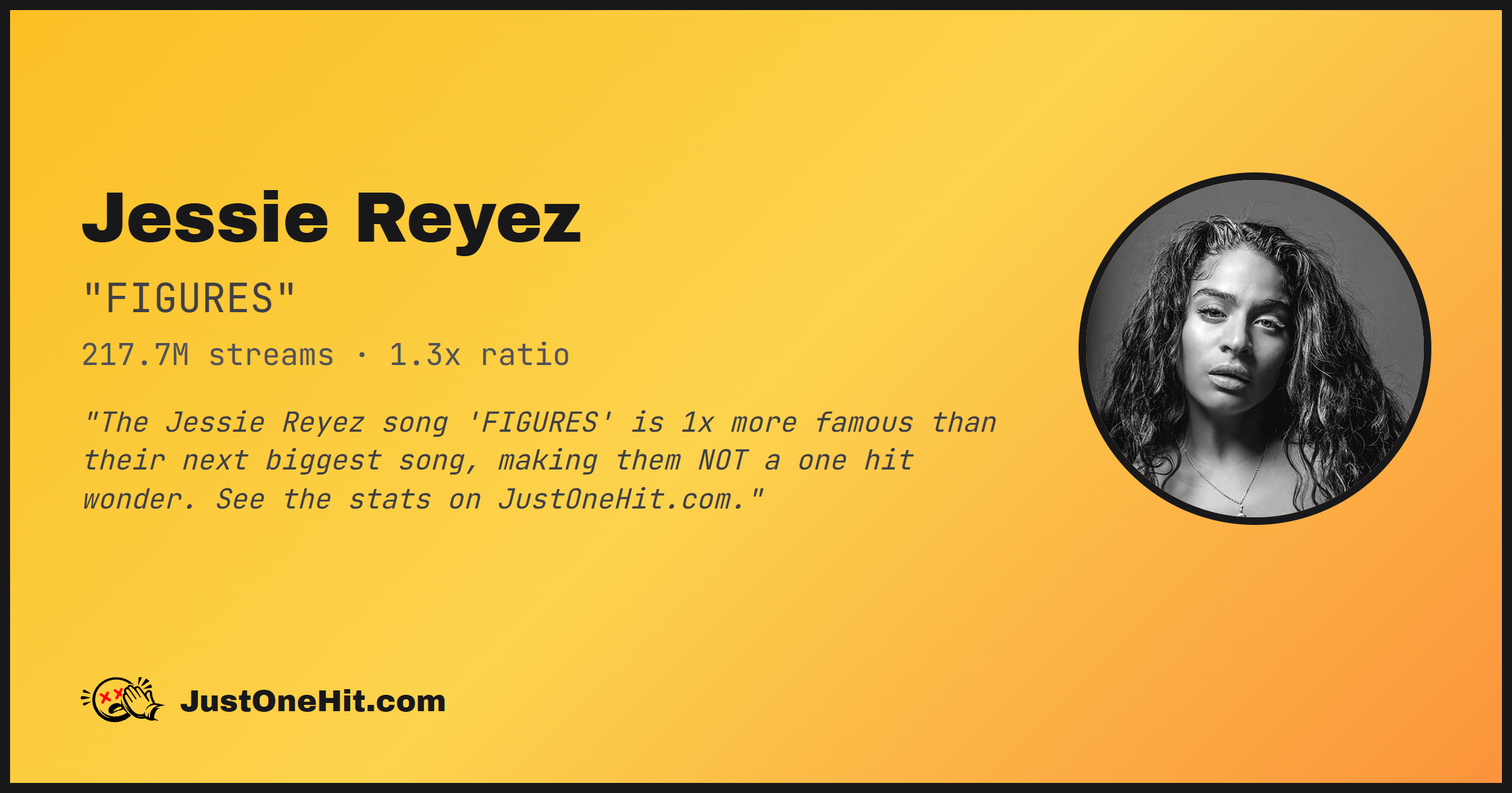 "The Jessie Reyez song 'FIGURES' is 1x more famous than their next biggest song, making them NOT a one hit wonder. See the stats on JustOneHit.com."