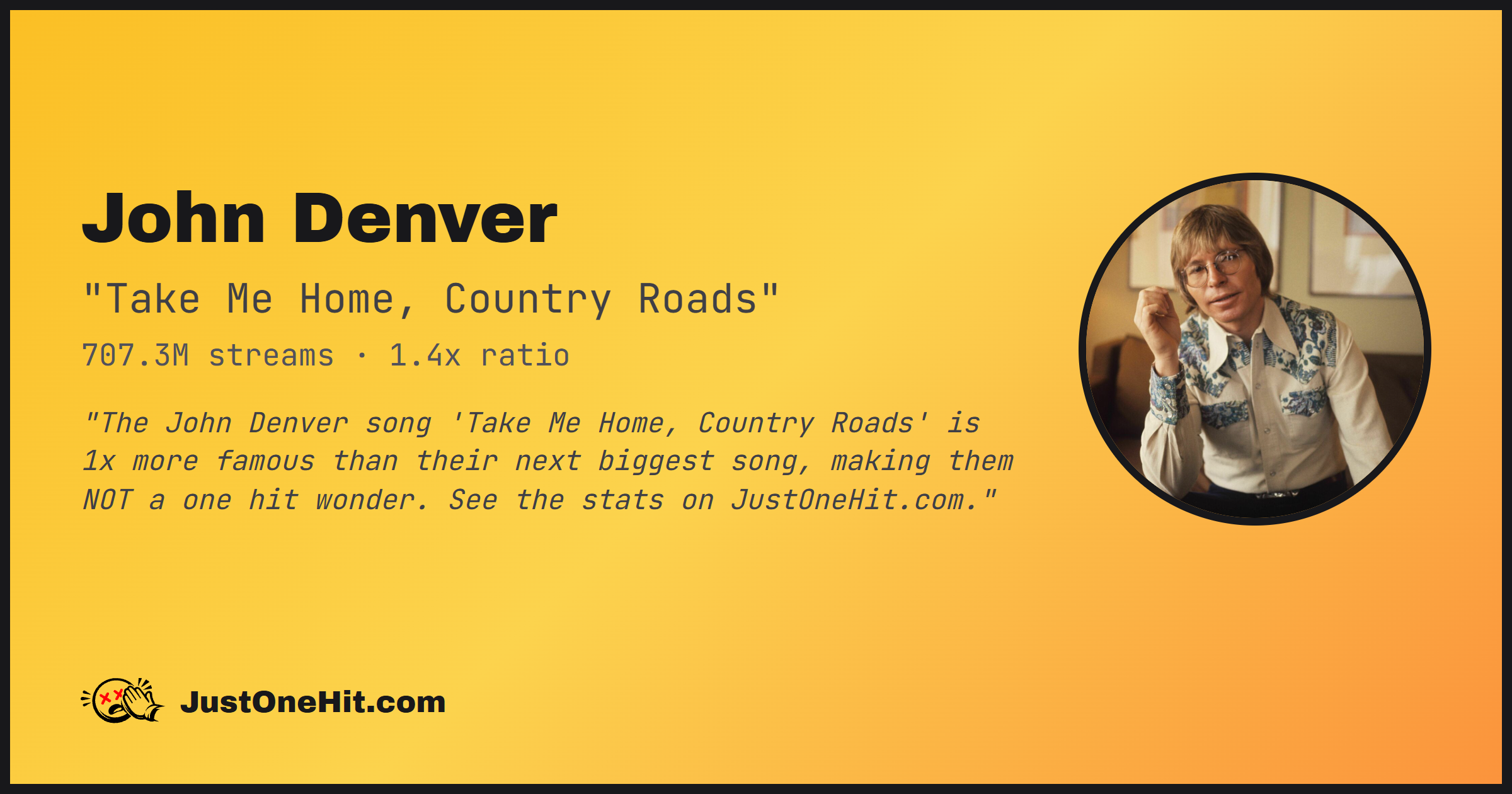 "The John Denver song 'Take Me Home, Country Roads' is 1x more famous than their next biggest song, making them NOT a one hit wonder. See the stats on JustOneHit.com."