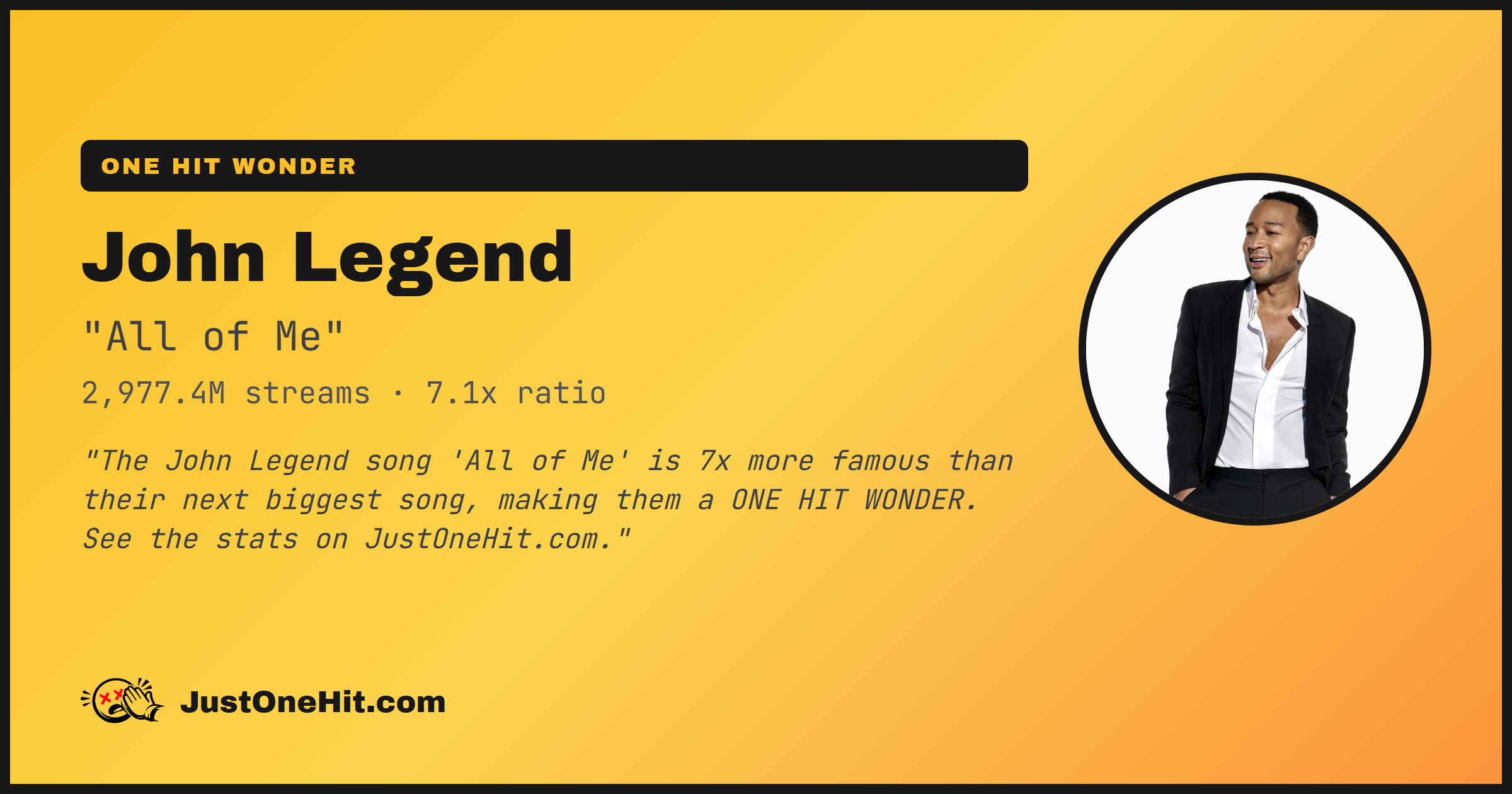 "The John Legend song 'All of Me' is 7x more famous than their next biggest song, making them a ONE HIT WONDER. See the stats on JustOneHit.com."