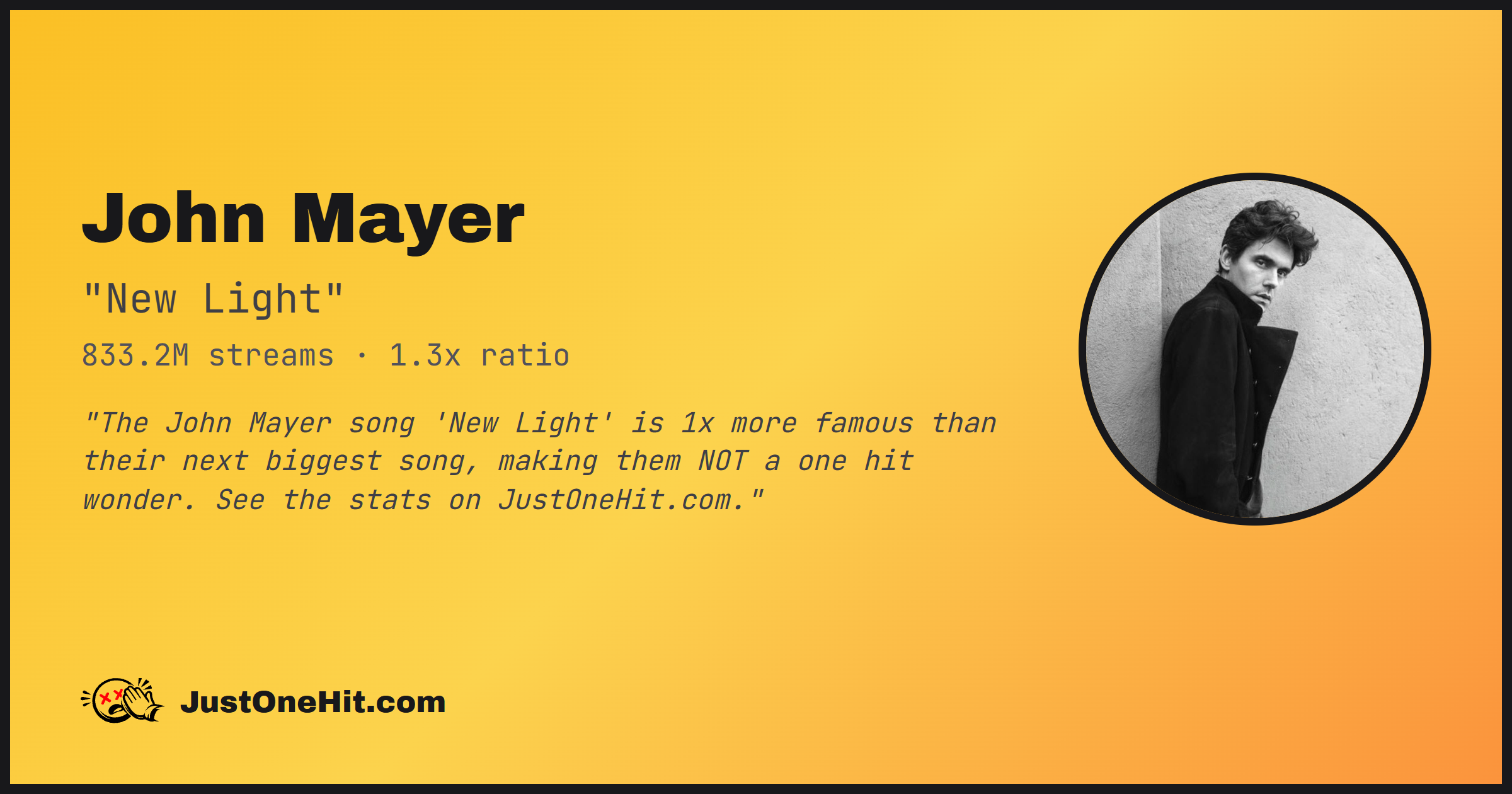 "The John Mayer song 'New Light' is 1x more famous than their next biggest song, making them NOT a one hit wonder. See the stats on JustOneHit.com."