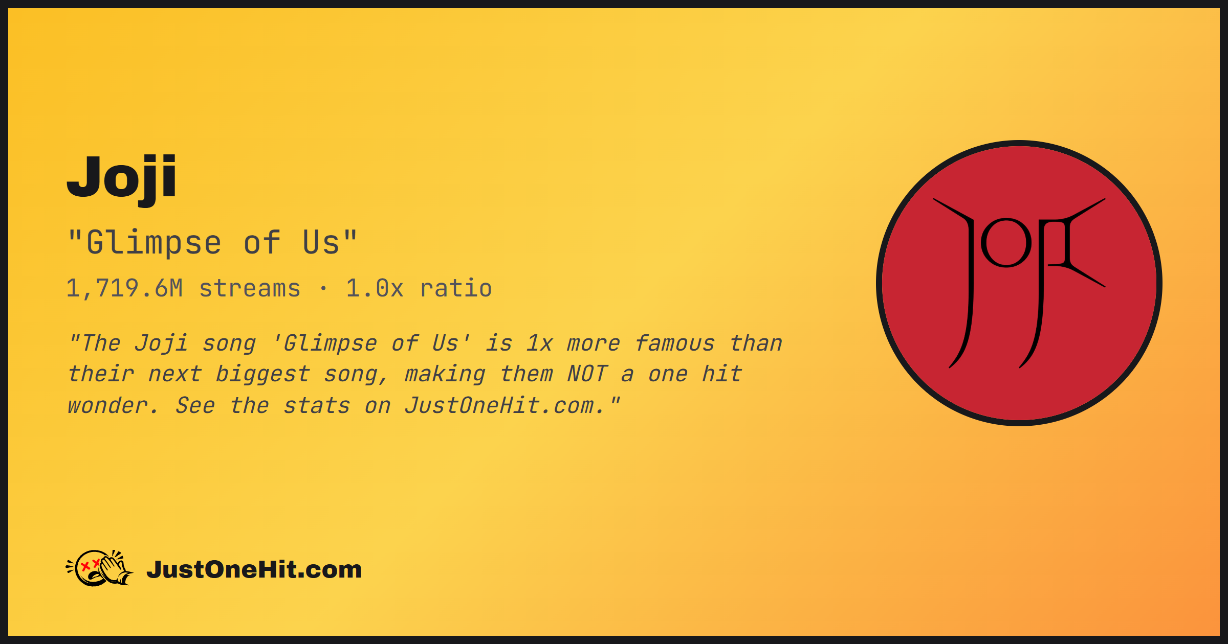 "The Joji song 'Glimpse of Us' is 1x more famous than their next biggest song, making them NOT a one hit wonder. See the stats on JustOneHit.com."
