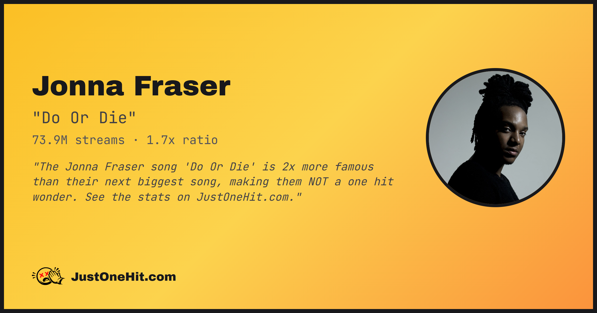 "The Jonna Fraser song 'Do Or Die' is 2x more famous than their next biggest song, making them NOT a one hit wonder. See the stats on JustOneHit.com."