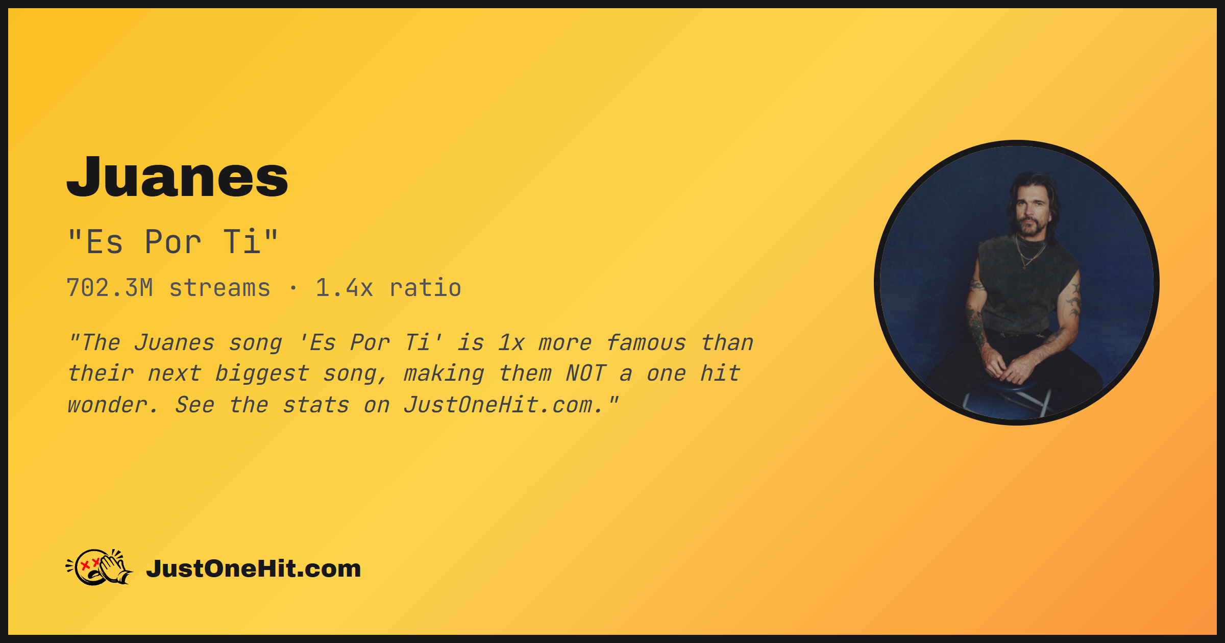 "The Juanes song 'Es Por Ti' is 1x more famous than their next biggest song, making them NOT a one hit wonder. See the stats on JustOneHit.com."