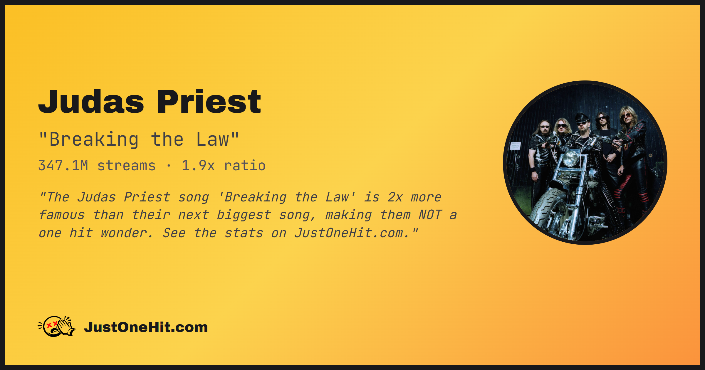 "The Judas Priest song 'Breaking the Law' is 2x more famous than their next biggest song, making them NOT a one hit wonder. See the stats on JustOneHit.com."