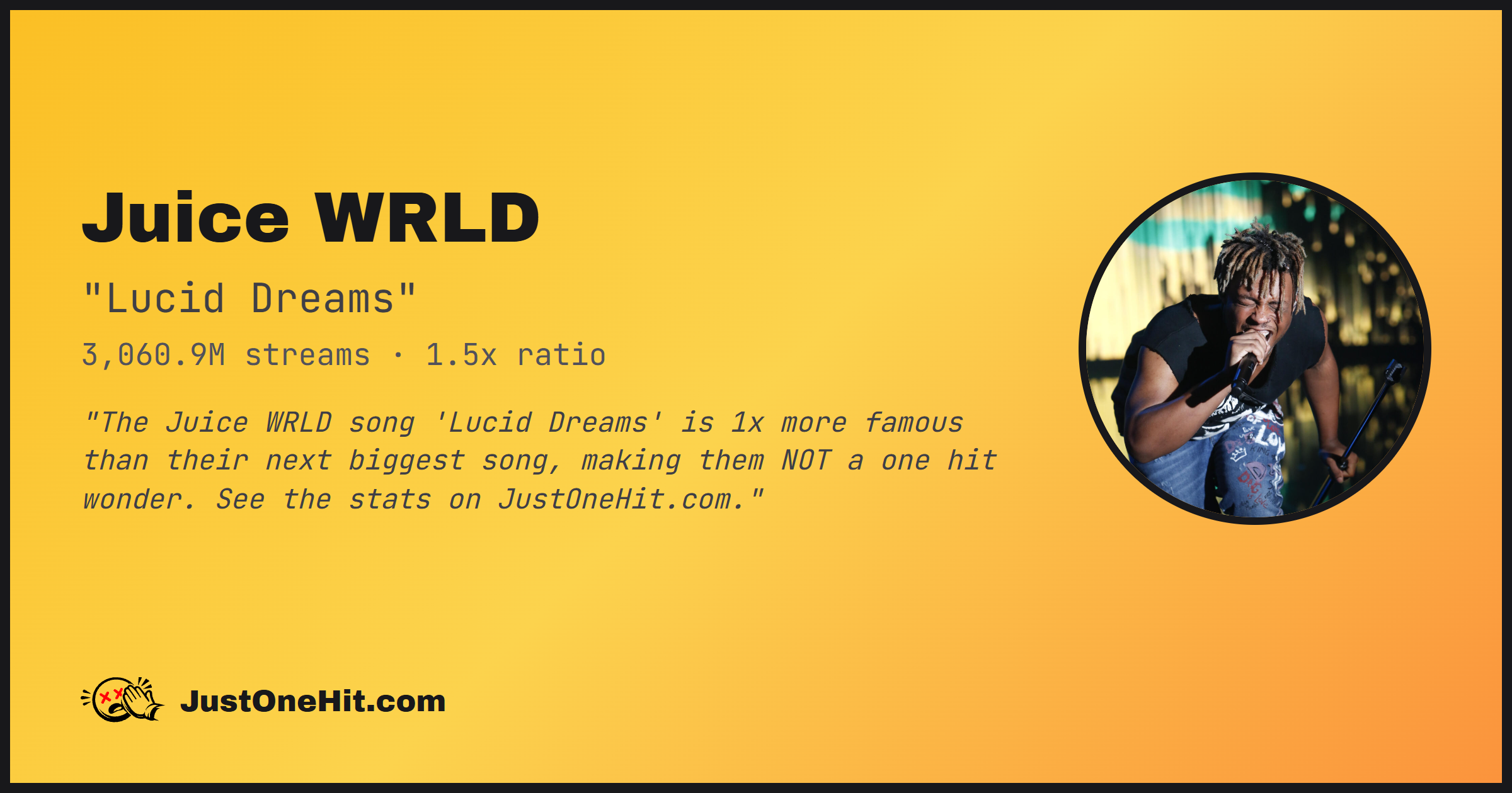 "The Juice WRLD song 'Lucid Dreams' is 1x more famous than their next biggest song, making them NOT a one hit wonder. See the stats on JustOneHit.com."
