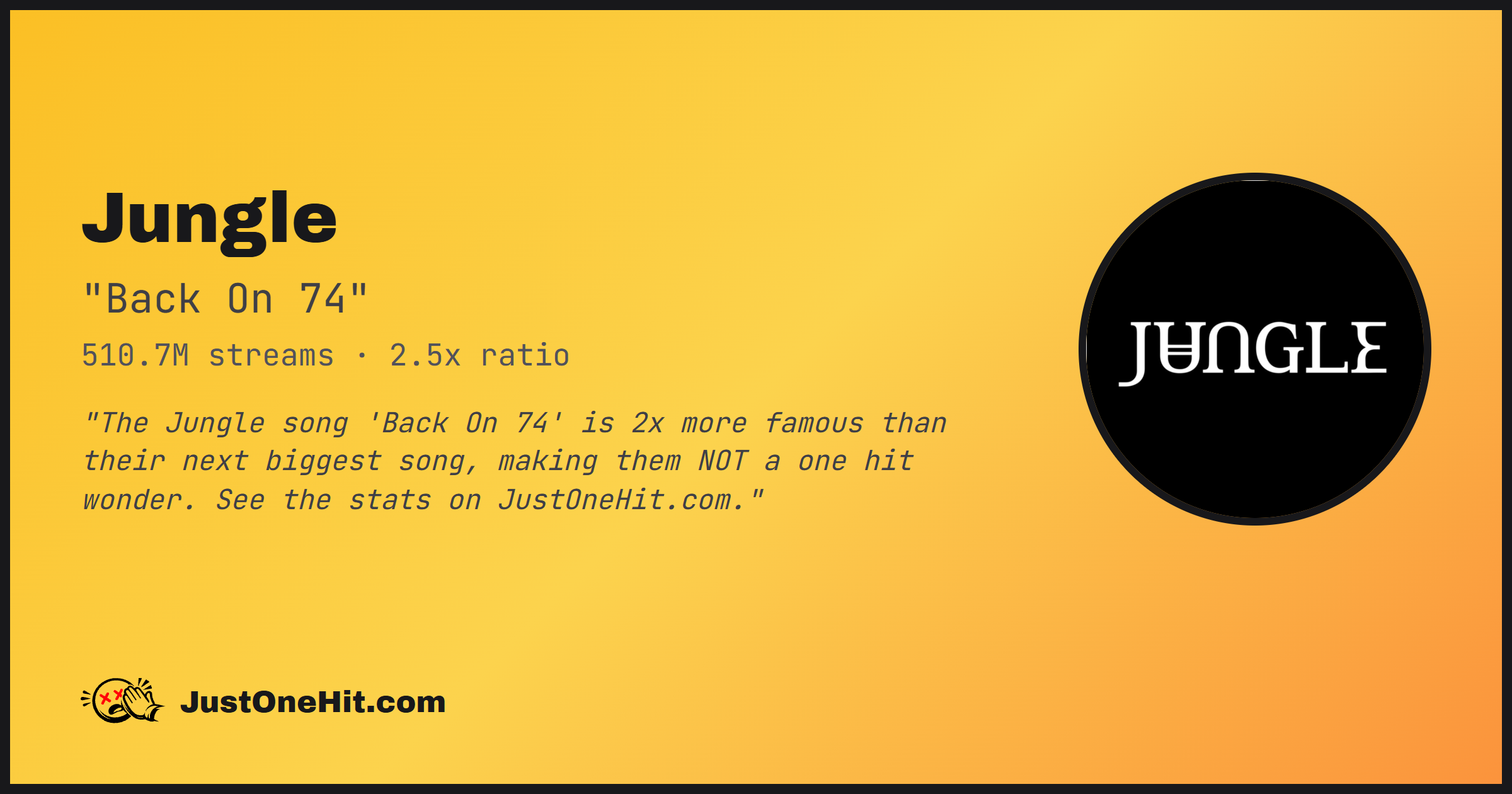 "The Jungle song 'Back On 74' is 3x more famous than their next biggest song, making them NOT a one hit wonder. See the stats on JustOneHit.com."