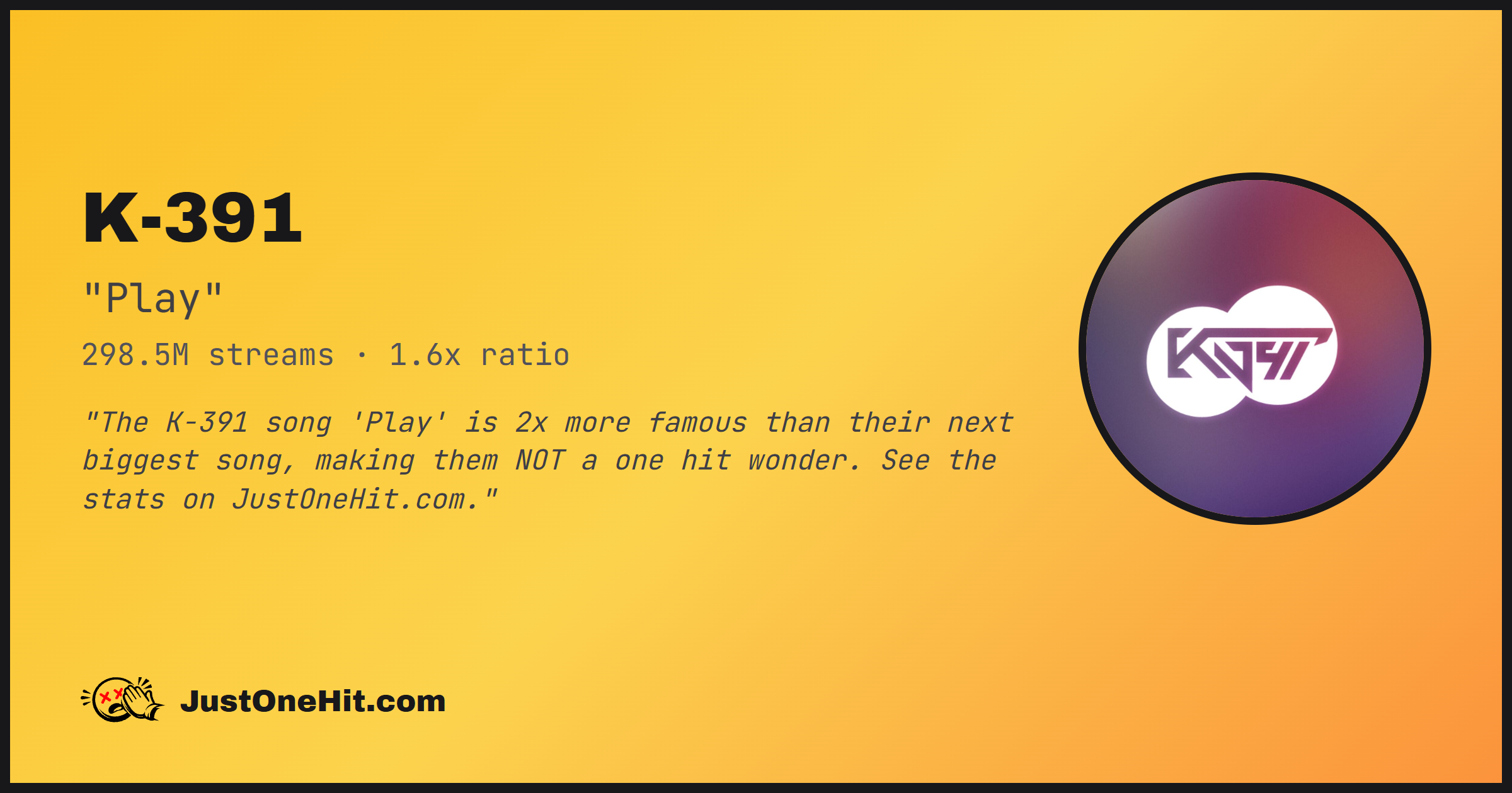 "The K-391 song 'Play' is 2x more famous than their next biggest song, making them NOT a one hit wonder. See the stats on JustOneHit.com."