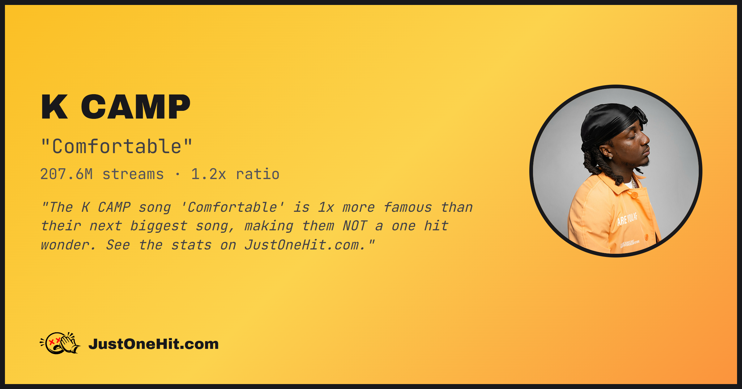 "The K CAMP song 'Comfortable' is 1x more famous than their next biggest song, making them NOT a one hit wonder. See the stats on JustOneHit.com."