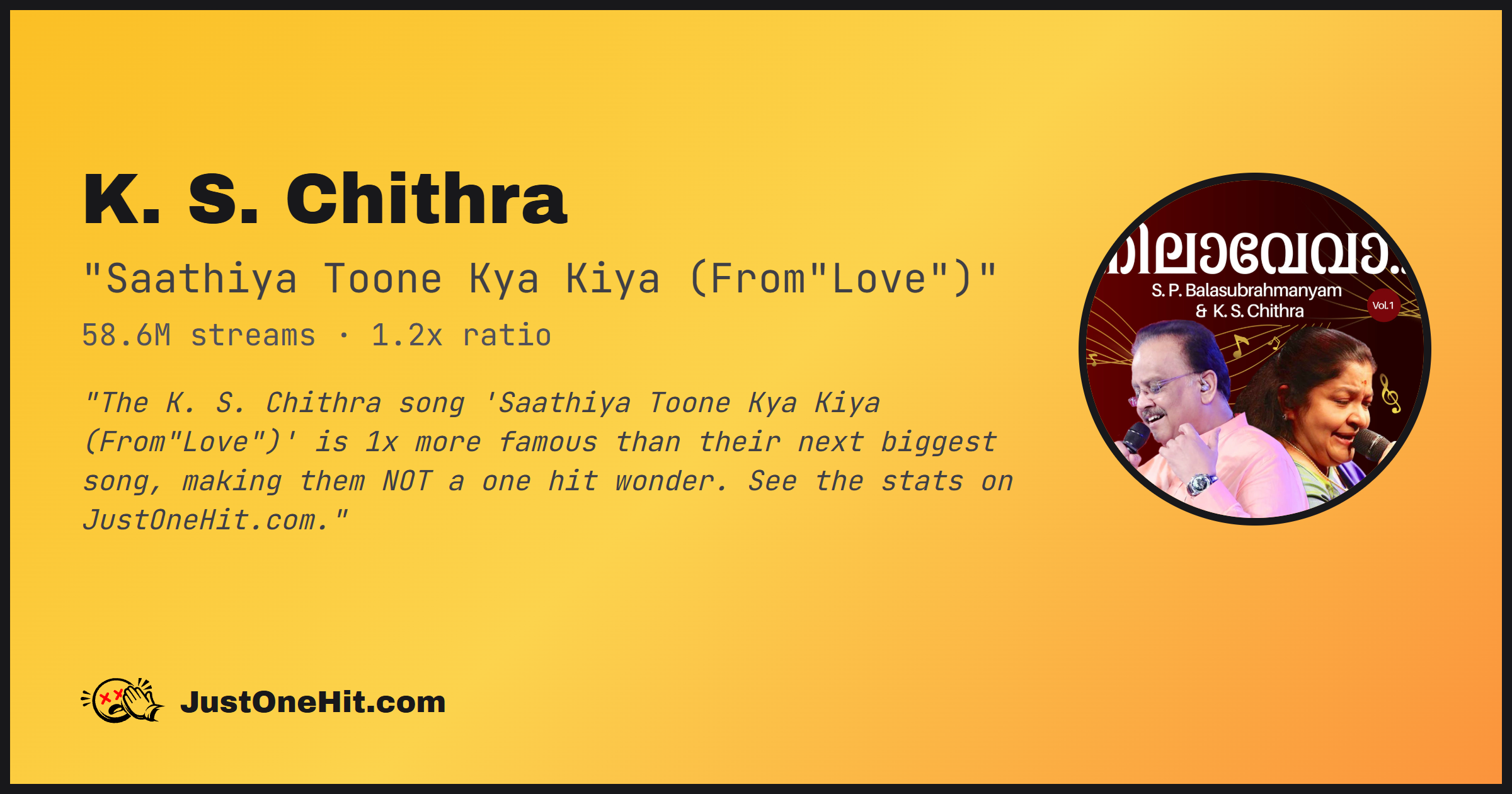"The K. S. Chithra song 'Saathiya Toone Kya Kiya (From"Love")' is 1x more famous than their next biggest song, making them NOT a one hit wonder. See the stats on JustOneHit.com."