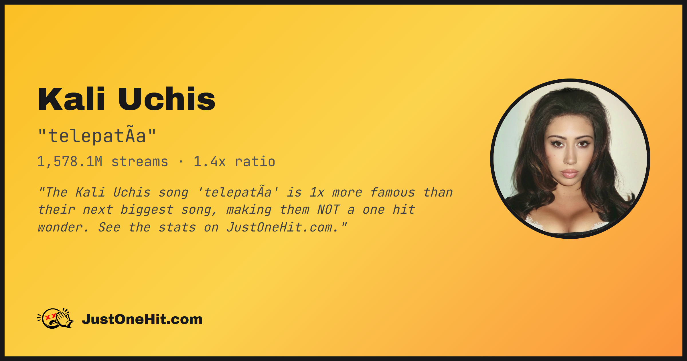 "The Kali Uchis song 'telepatÃa' is 1x more famous than their next biggest song, making them NOT a one hit wonder. See the stats on JustOneHit.com."