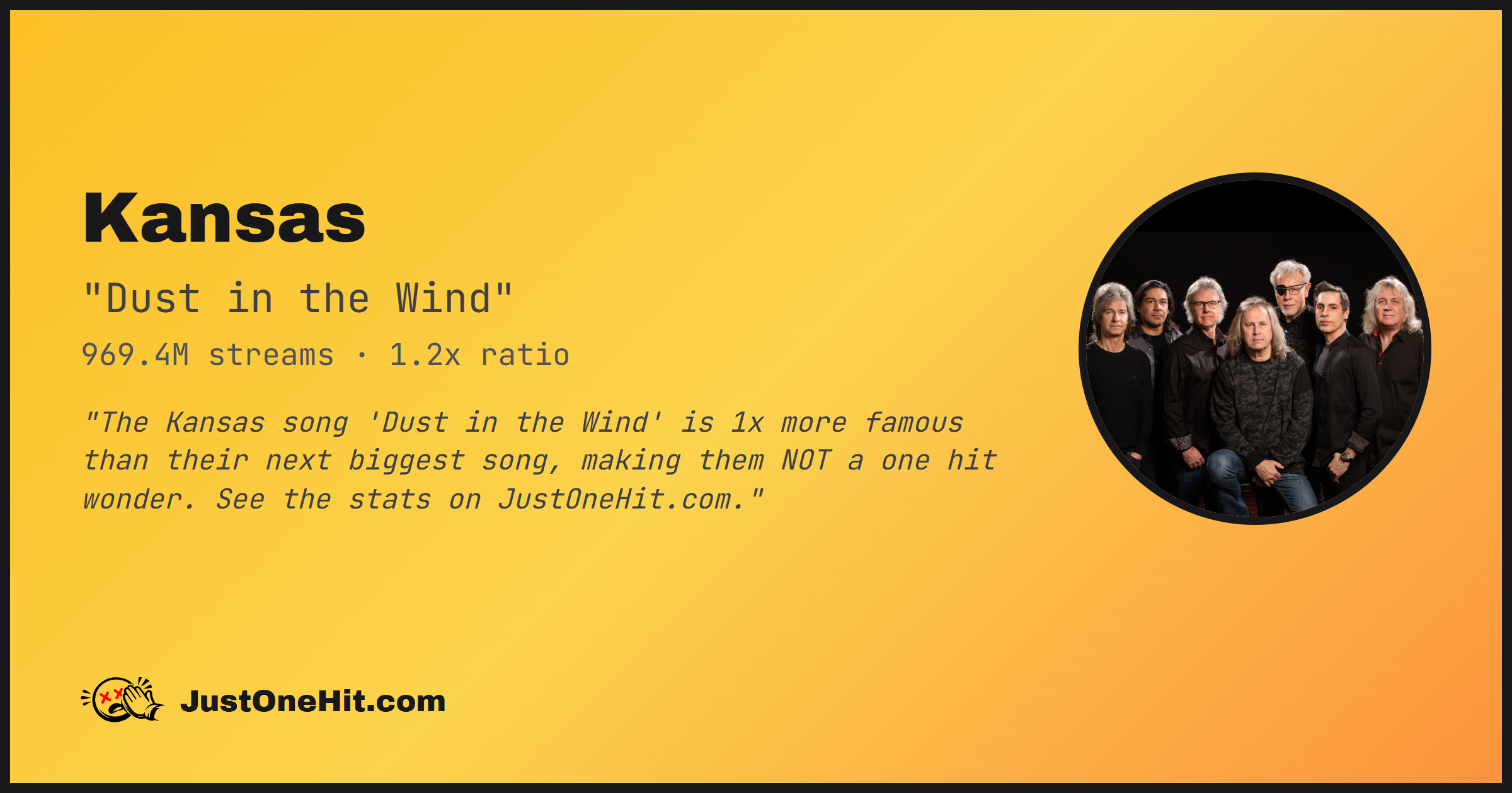 "The Kansas song 'Dust in the Wind' is 1x more famous than their next biggest song, making them NOT a one hit wonder. See the stats on JustOneHit.com."