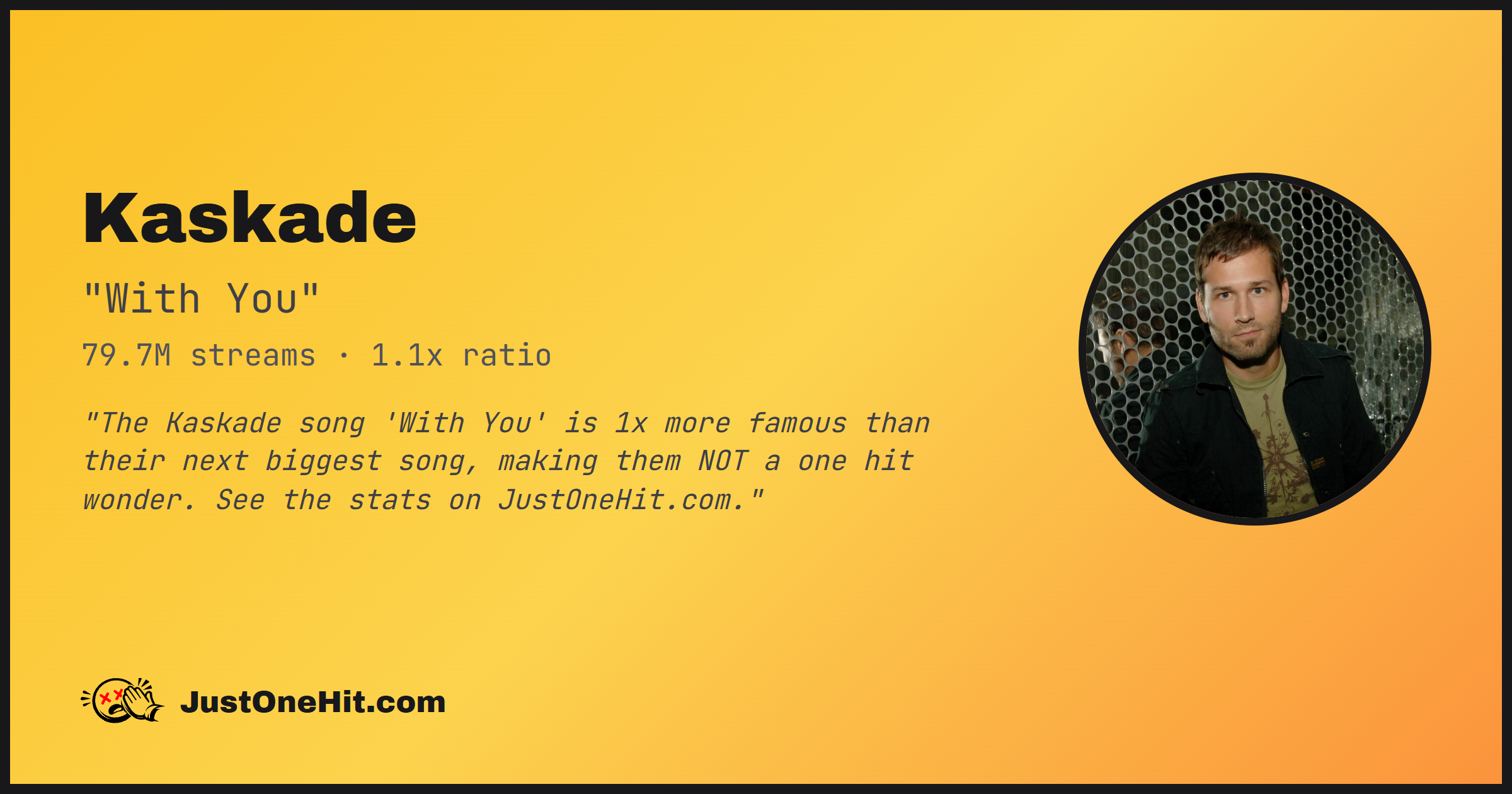 "The Kaskade song 'With You' is 1x more famous than their next biggest song, making them NOT a one hit wonder. See the stats on JustOneHit.com."