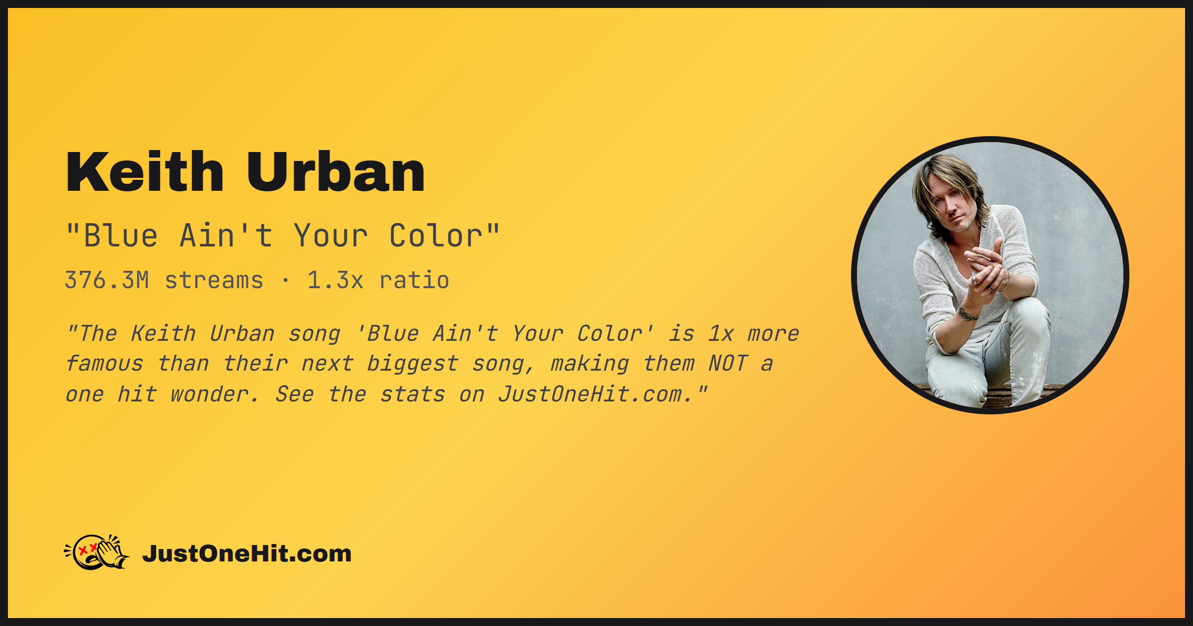 "The Keith Urban song 'Blue Ain't Your Color' is 1x more famous than their next biggest song, making them NOT a one hit wonder. See the stats on JustOneHit.com."